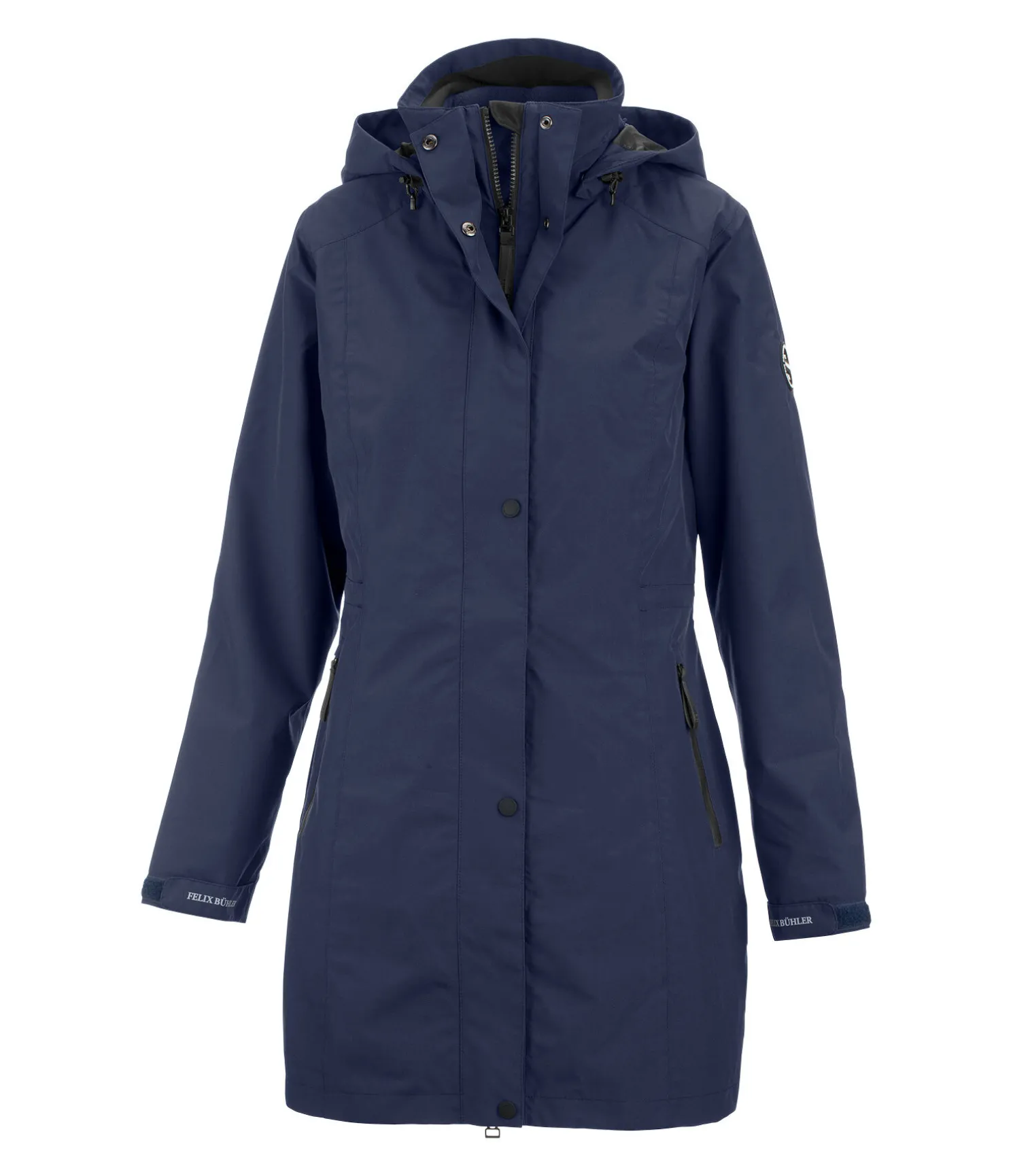 Le manteau d’équitation technique Felix Bühler offre 3 styles différents : tu peux porter chaque couche séparément ou ensemble ! Le manteau extérieur coupe-vent, imperméable (10.000 mm) et respirant possède une capuche réglable et amovible, pouvant être fixée dans le dos par bouton-pression. Fermeture à glissière double sens dissimulée avec protège-menton, 2 poches zippées imperméables, cordon de serrage à la taille, bas des manches réglables par patte auto-agrippante avec imprimé réfléchissant, 1 poche intérieure zippée, 1 longue fente cavalière avec sous-patte et fermeture à glissière à l’arrière. La doublure en polaire se fixe avec une fermeture à glissière et peut donc être portée avec ou sans le manteau extérieur. Cette doublure a un col montant, 2 poches zippées et une fente cavalière avec fermeture à glissière à l’arrière. 100 % polyester.