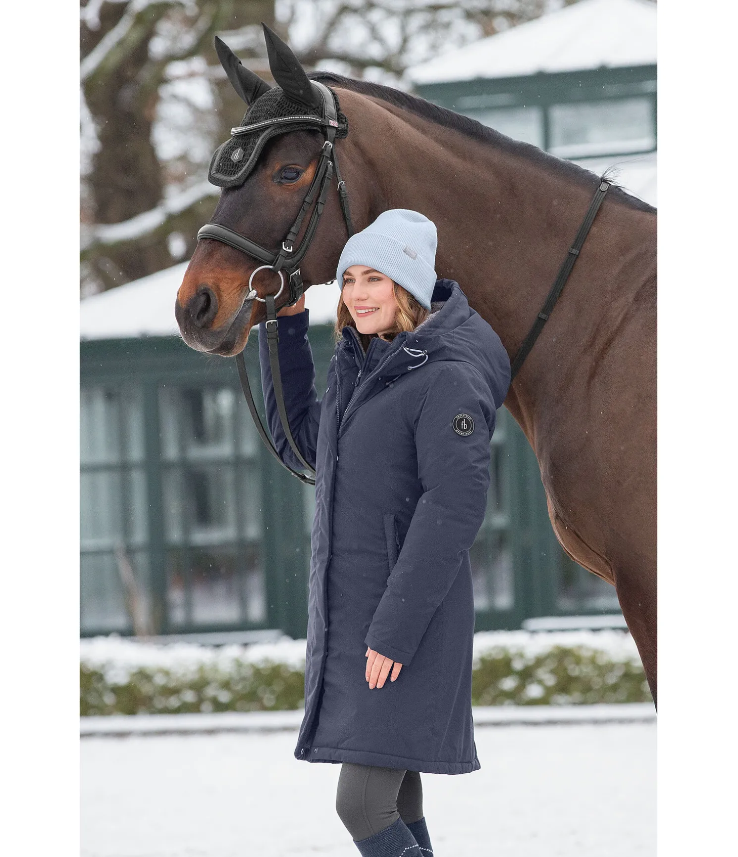 Manteau d’équitation d’hiver long. Particulièrement chaud. Col montant. Large capuche réglable, en partie repliable, avec système de fixation dans le dos. Matière imperméable (10.000 mm), coupe-vent et respirante (5.000 MVTR). Garnissage imitation duvet. Finition en bord-côte sur le bas des manches. Deux poches latérales zippées dissimulées et une poche intérieure. Fermeture à glissière double sens dissimulée avec protège-menton. Une fente cavalière zippée à l’arrière. Motifs gaufrés discrets à l’intérieur. Badge Felix Bühler sur la manche. 100 % polyester.