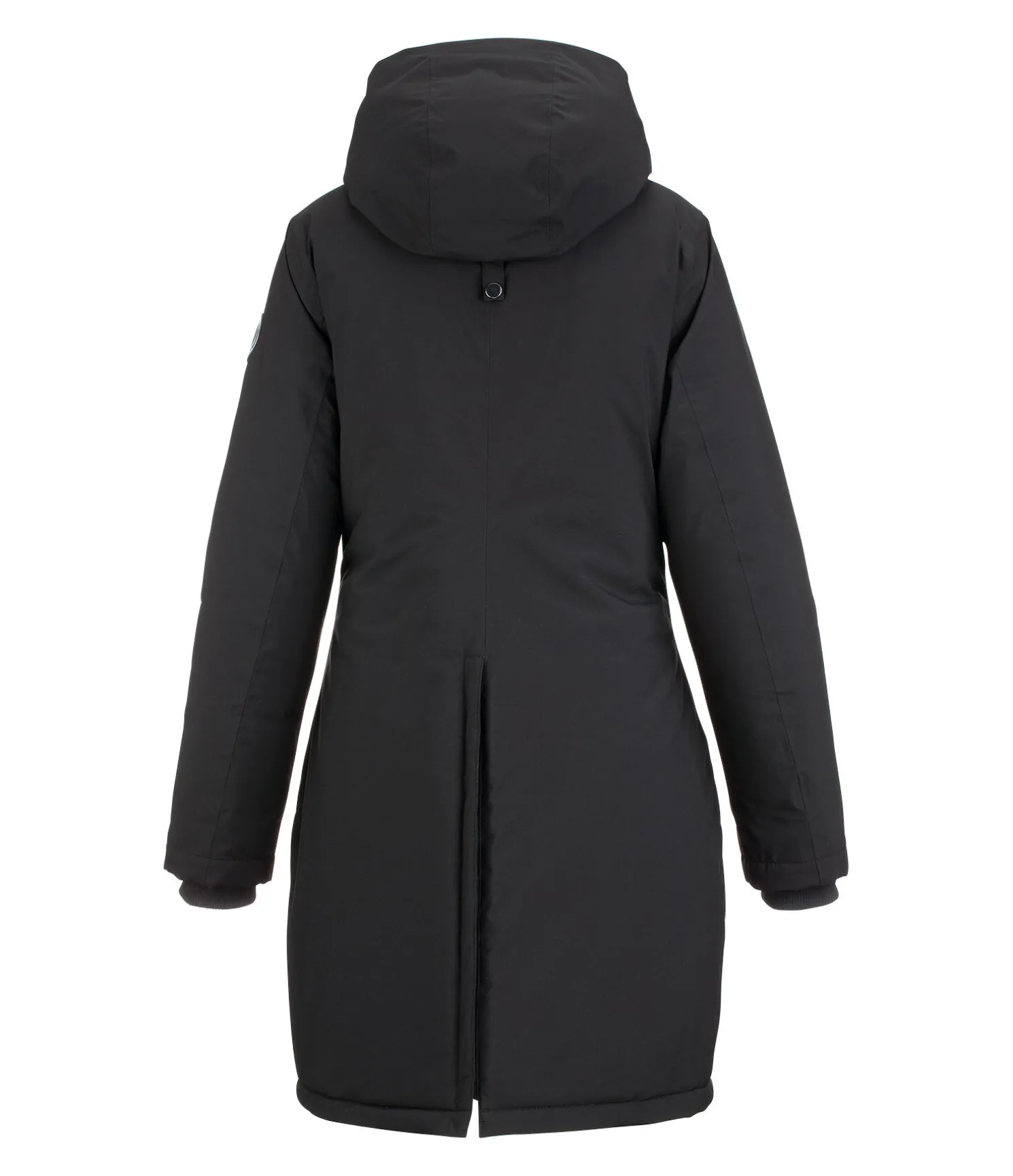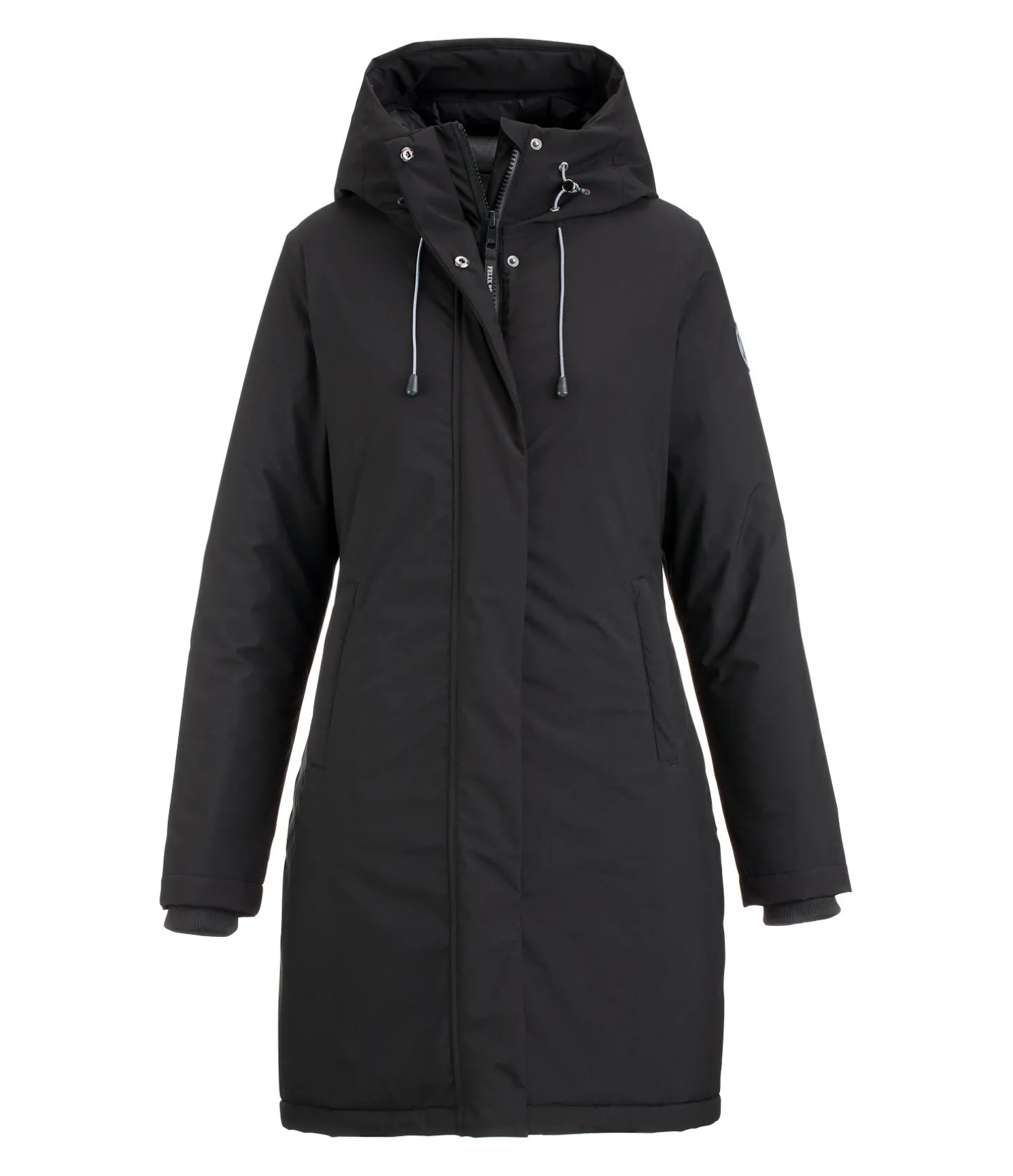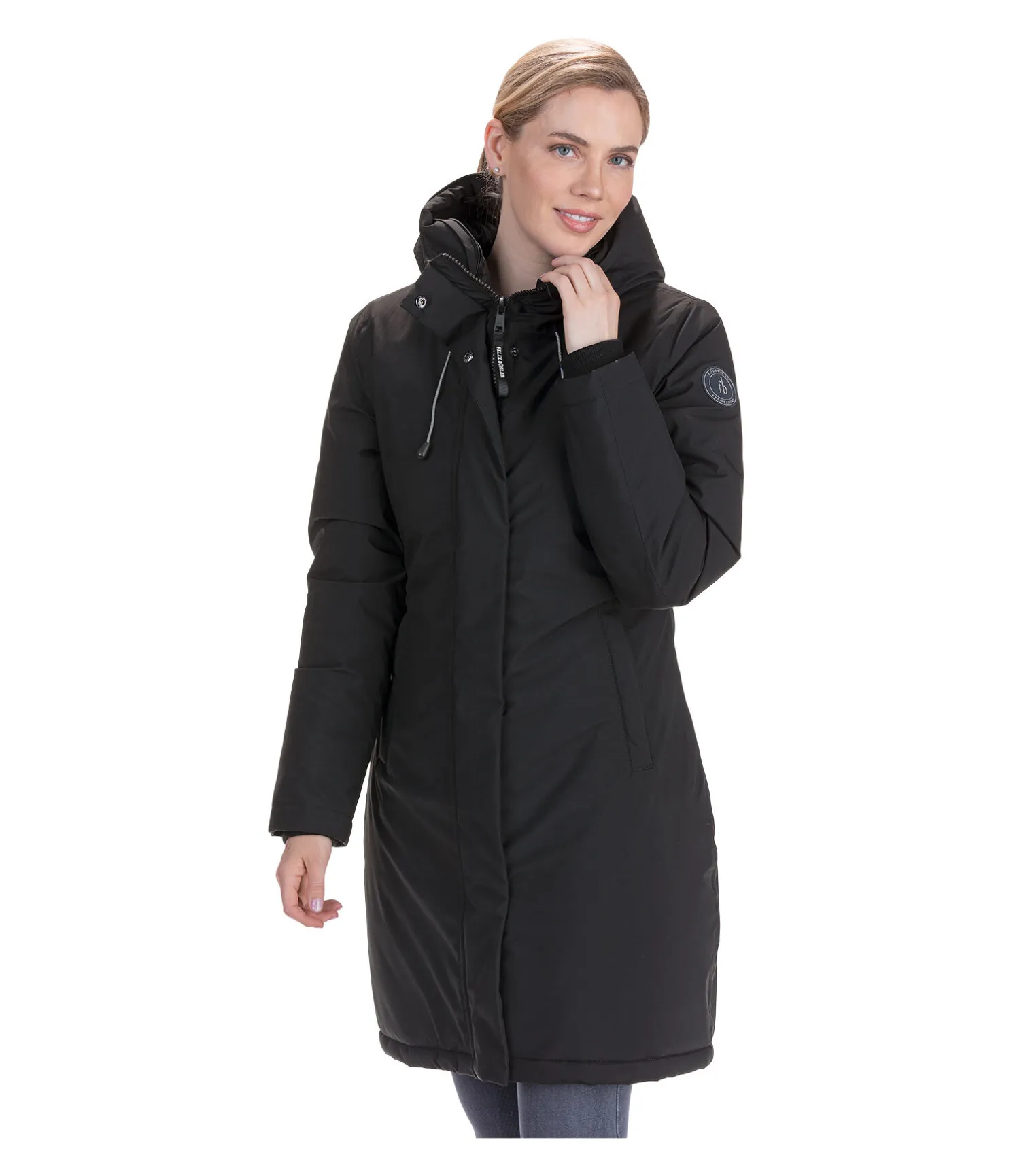Manteau d’équitation d’hiver long. Particulièrement chaud. Col montant. Large capuche réglable, en partie repliable, avec système de fixation dans le dos. Matière imperméable (10.000 mm), coupe-vent et respirante (5.000 MVTR). Garnissage imitation duvet. Finition en bord-côte sur le bas des manches. Deux poches latérales zippées dissimulées et une poche intérieure. Fermeture à glissière double sens dissimulée avec protège-menton. Une fente cavalière zippée à l’arrière. Motifs gaufrés discrets à l’intérieur. Badge Felix Bühler sur la manche. 100 % polyester.
