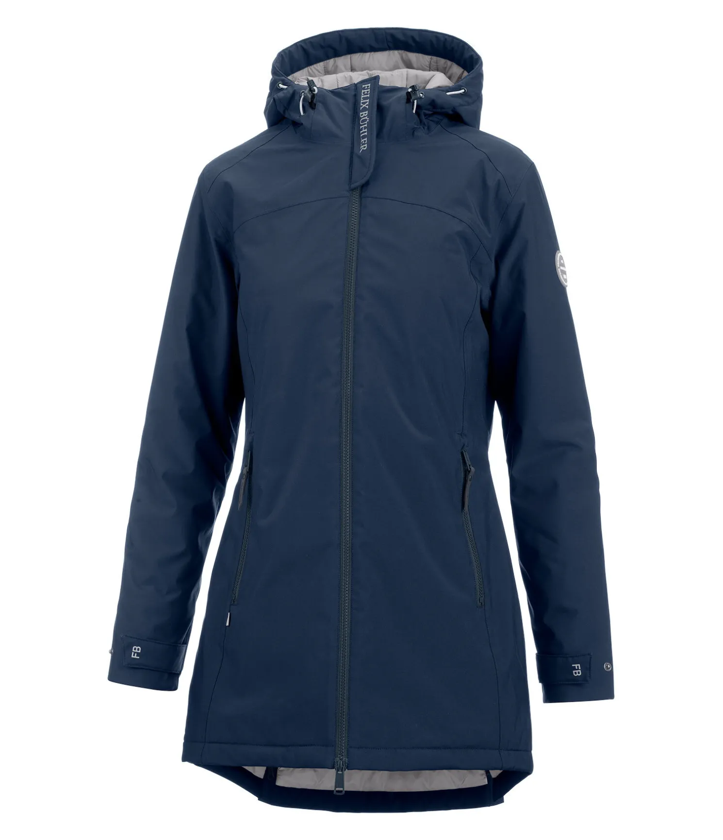 Manteau d’équitation technique avec garnissage chaud en imitation duvet et capuche. Imperméable (10.000 mm), coupe-vent et respirant. Fermeture à glissière double sens avec sous-patte, 2 poches zippées devant, 1 poche intérieure zippée, bas des manches réglables, col haut avec capuche rembourrée réglable. 2 fentes cavalières zippées à l’arrière. Badge Felix Bühler sur la manche et imprimé réfléchissant Felix Bühler sur le col. 100 % polyester.