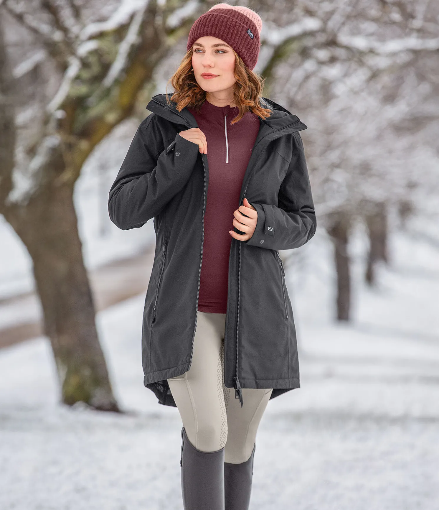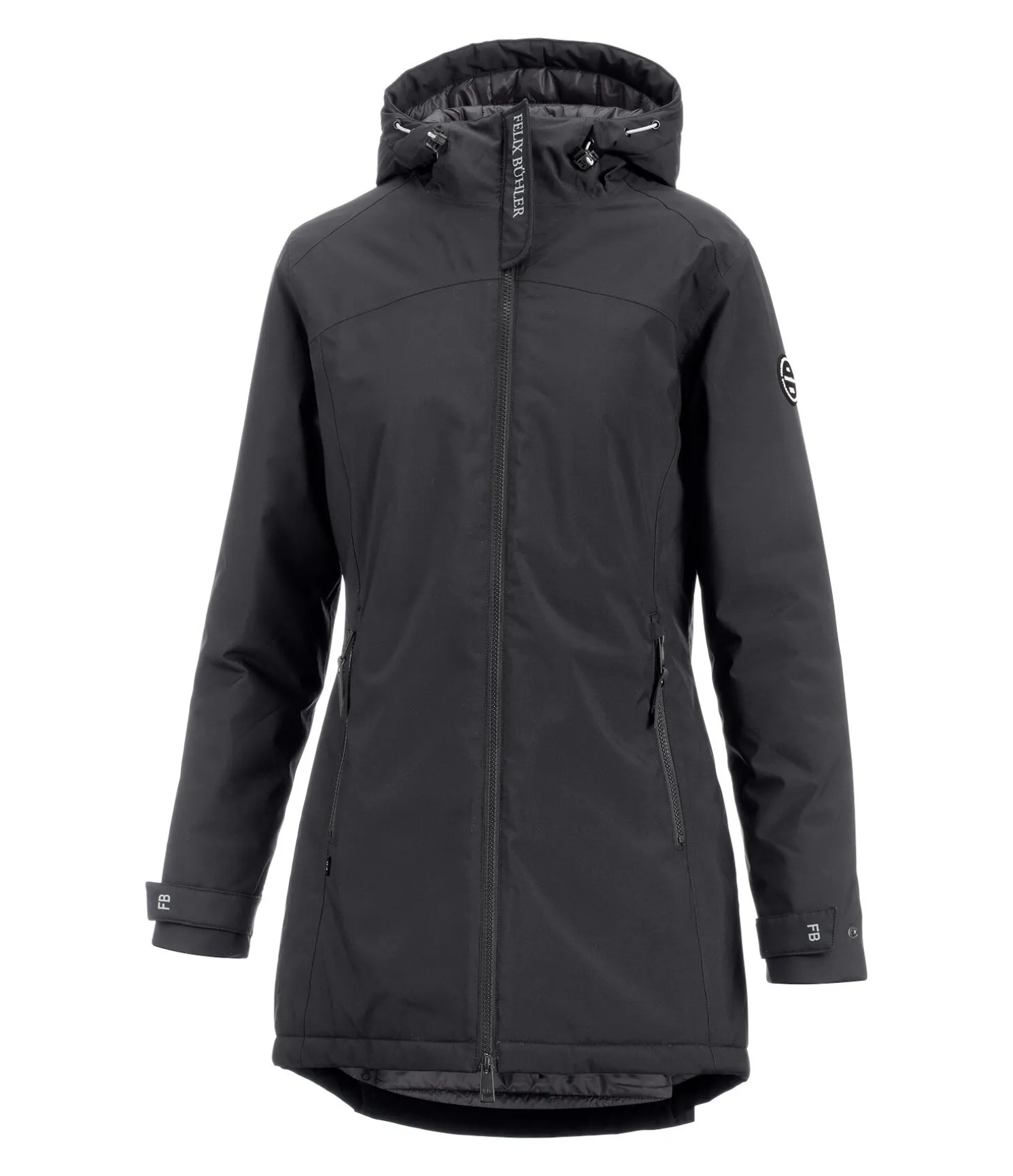 Manteau d’équitation technique avec garnissage chaud en imitation duvet et capuche. Imperméable (10.000 mm), coupe-vent et respirant. Fermeture à glissière double sens avec sous-patte, 2 poches zippées devant, 1 poche intérieure zippée, bas des manches réglables, col haut avec capuche rembourrée réglable. 2 fentes cavalières zippées à l’arrière. Badge Felix Bühler sur la manche et imprimé réfléchissant Felix Bühler sur le col. 100 % polyester.
