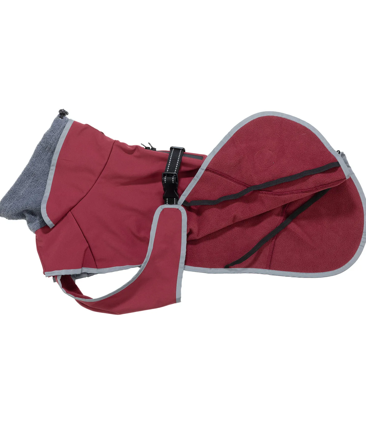 Manteau pour chien particulièrement léger, déperlant et respirant (100 deniers) en matière softshell coupe-vent. La doublure polaire molletonnée maintient au chaud. Facile à fermer grâce à une fermeture à clip sur le rabat ventral. Coupe sportive avec un grand pli d’aisance supplémentaire au poitrail pour une liberté de mouvement maximale. Convient également pour l’entraînement ou les activités d’endurance. Passepoil réfléchissant sur le pourtour pour plus de visibilité sur la route. Écusson logo également réfléchissant. Col douillet et généreux en polaire douce aspect chiné. Longueur de dos réglable par un élastique afin d’être parfaitement ajusté même avec une queue haute. Avec passage de harnais zippé étanche et courroies de cuisses élastiques. 100 % polyester.