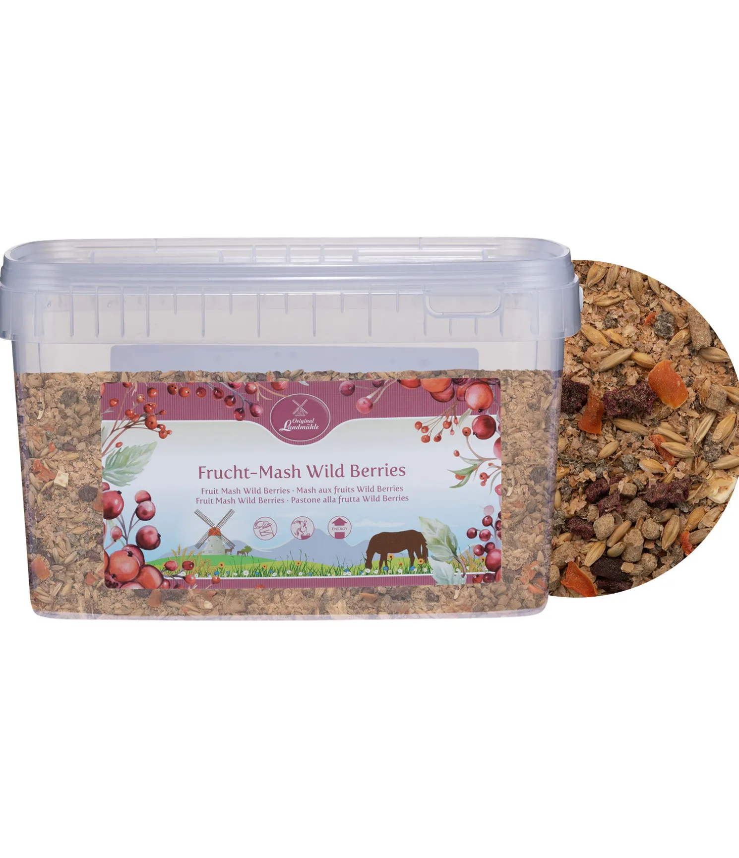 Face au succès de nos chips aux fruits secs (réf. : 490899, 490852, 490853), nous avons développé une large gamme de mashs aux fruits secs. L’avoine et les copeaux de betterave apportent énergie et saveur au mash aux fruits. Particulièrement adapté pour l’alimentation des chevaux difficiles ou ayant des problèmes d’alimentation. Son de riz, graines de lin et levure de bière pouvant aider la digestion et avoir un effet bénéfique sur la peau et le pelage. Le mash Baies sauvages contient des baies de goji et des canneberges sèches, riches en vitamines et en particulier en vitamine C pour renforcer le système immunitaire.
