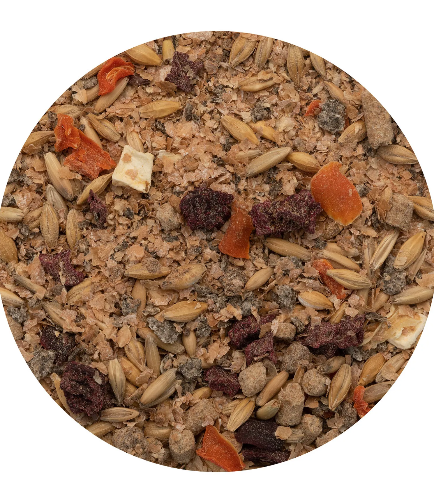 Composition : son de blé, copeaux de betterave sucrière (séchés), avoine, orge, son de riz, graines de lin, carbonate de calcium, tourteau de lin, mélasse de betterave sucrière, drêches séchées, levure de bière, baies de goji (séchées), marc d’argousier, canneberges (séchées), marc d’aronia, huile de lin.