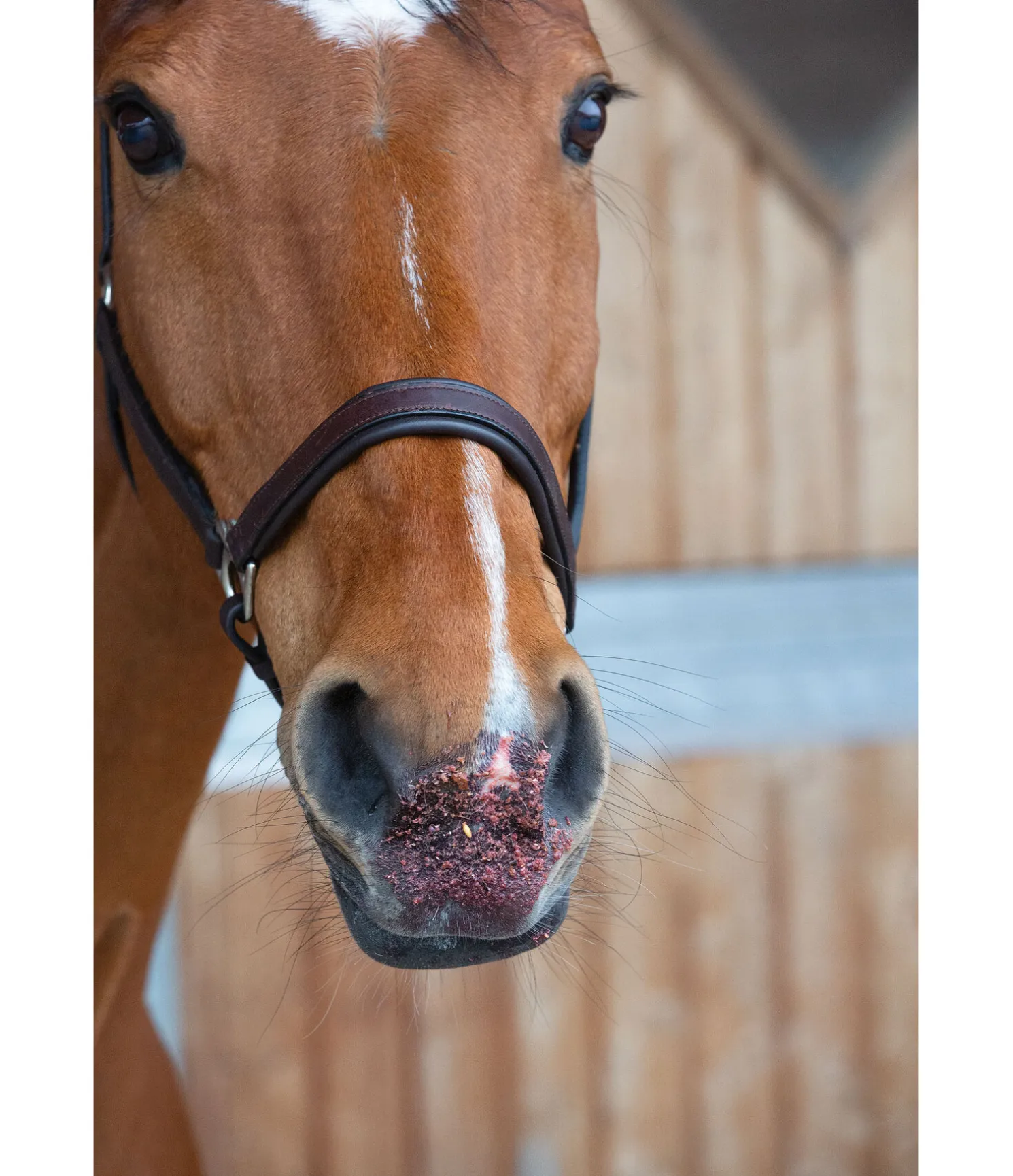 Composition : son de blé, orge (aplatie), avoine noire, grains de maïs (aplatis), tourteau de lin, 6.58 % de marc de pomme, 3 % de betterave rouge (séchée), mélasse de betterave sucrière, 2 % de mélange de fruits (25 % de dés de pommes, 25 % de dés de carottes, 20 % de chips de bananes, 15 % de dés de betteraves rouges, 15 % de cynorrhodon), levure de bière. *La recette contenant un prémix, le total fait plus de 100 %.