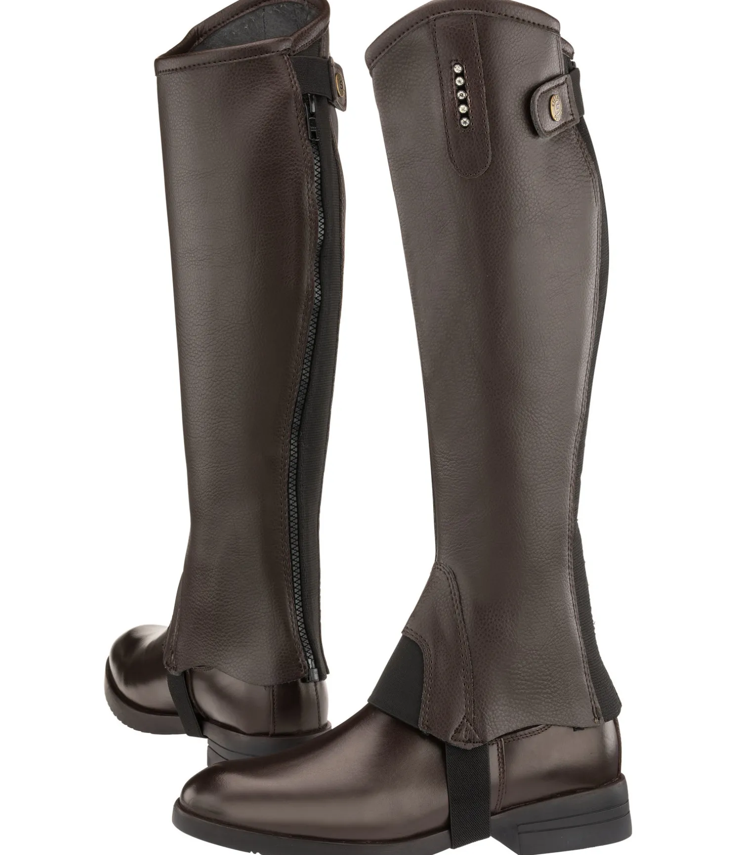 Mini-chaps élégantes dans un design évoquant des bottes cavalières, ornées de strass scintillants. Dessus en matière synthétique aspect grainé, insert élastique le long de la glissière YKK résistante sur la partie arrière pour un ajustement parfait au mollet. Autres détails : fermeture par bouton-pression, sous-pieds élastiques et doublure légère en polaire.