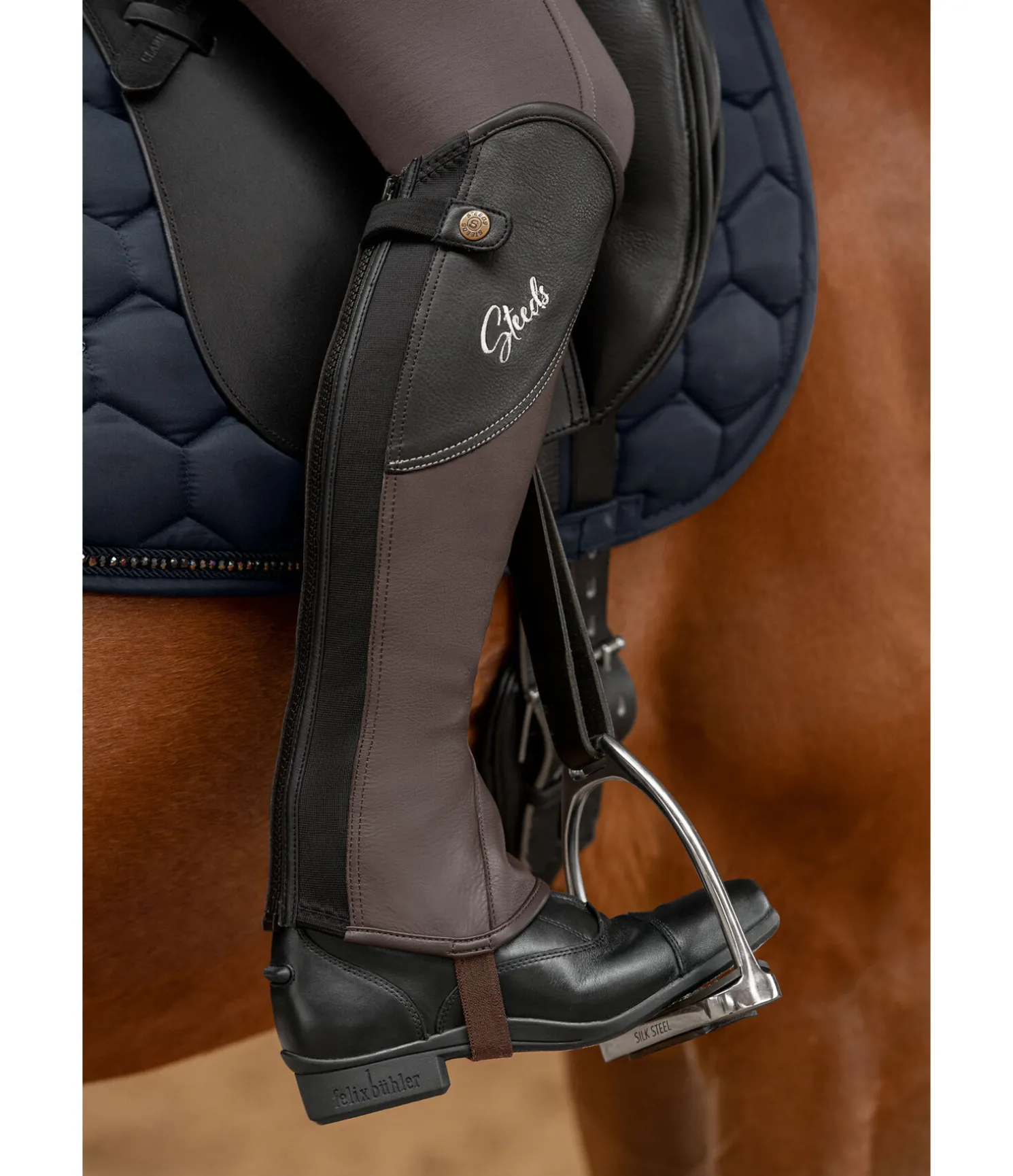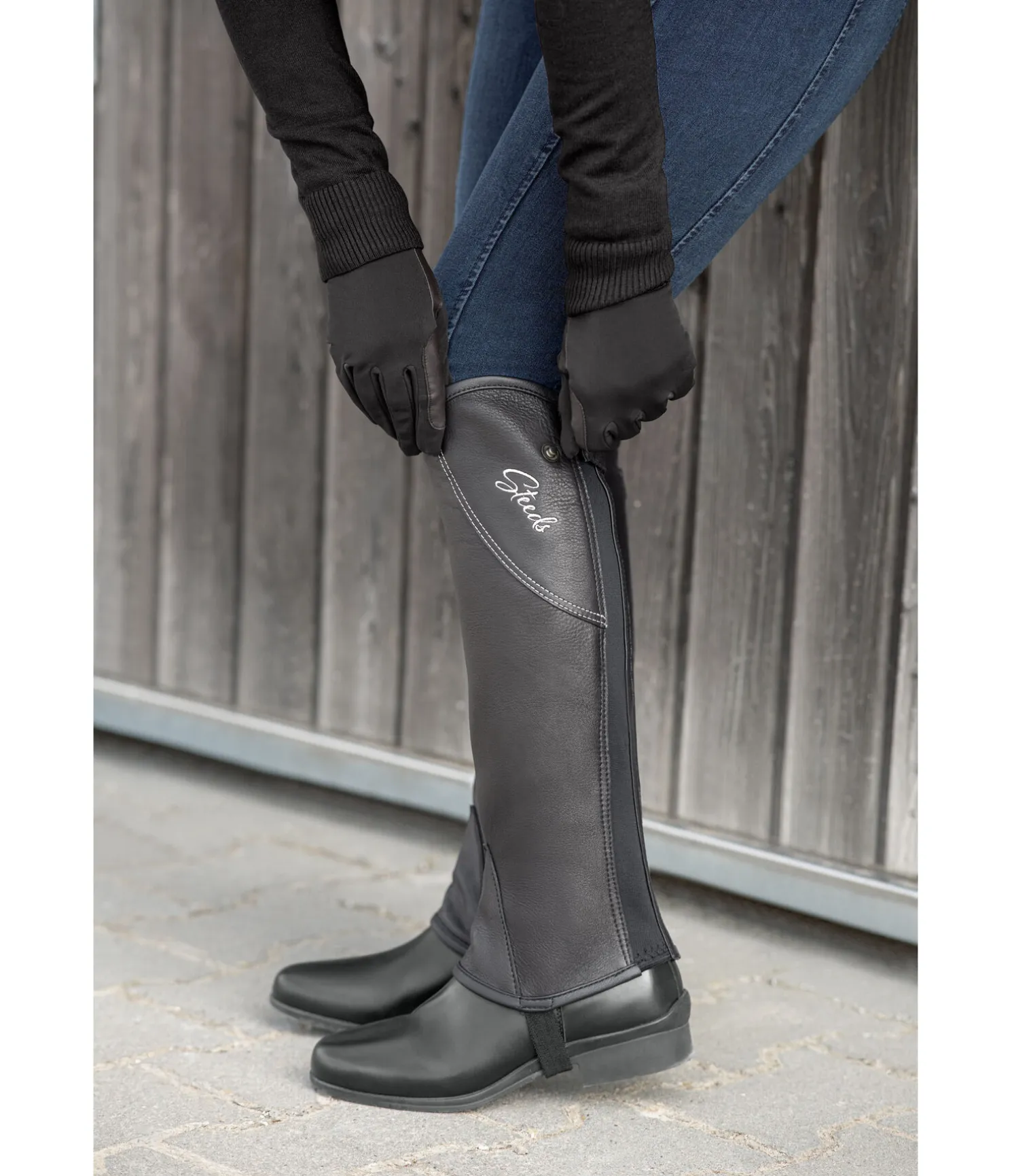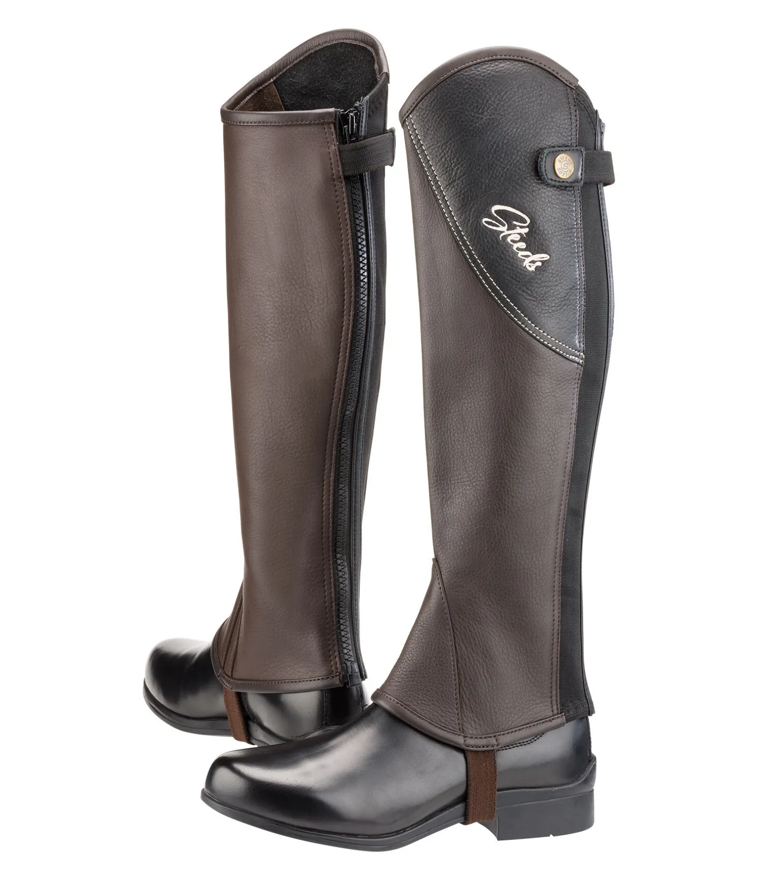 Mini-chaps au look exceptionnel. Insert en cuir avec coutures et logo de couleur contrastante sur le haut de la tige. Souples et élegantes. Fermeture à glissière à l’arrière avec inserts élastiqués de chaque côté pour un ajustement optimal. Dessus en cuir de vachette naturellement grainé, à la fois souple et résistant.
