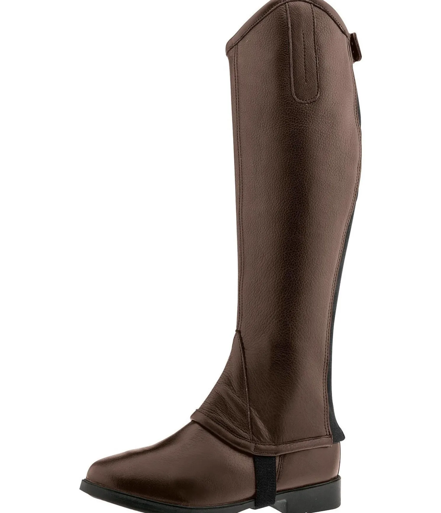 Mini-chaps souples dans un design évoquant des bottes cavalières. Dessus en cuir de vachette naturellement grainé, doux et résistant. Empiècements élastiqués le long de la fermeture à glissière pour un ajustement optimal.