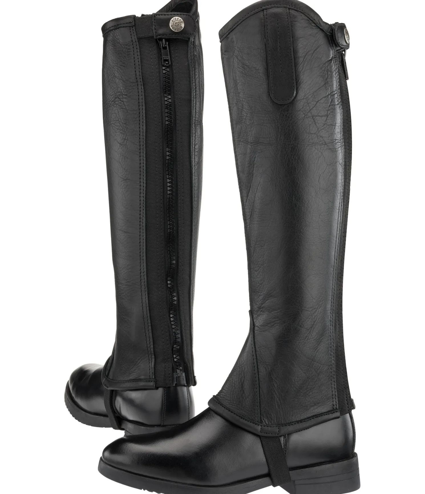 Mini-chaps souples dans un design évoquant des bottes cavalières. Dessus en cuir de vachette naturellement grainé, doux et résistant. Empiècements élastiqués le long de la fermeture à glissière pour un ajustement optimal.