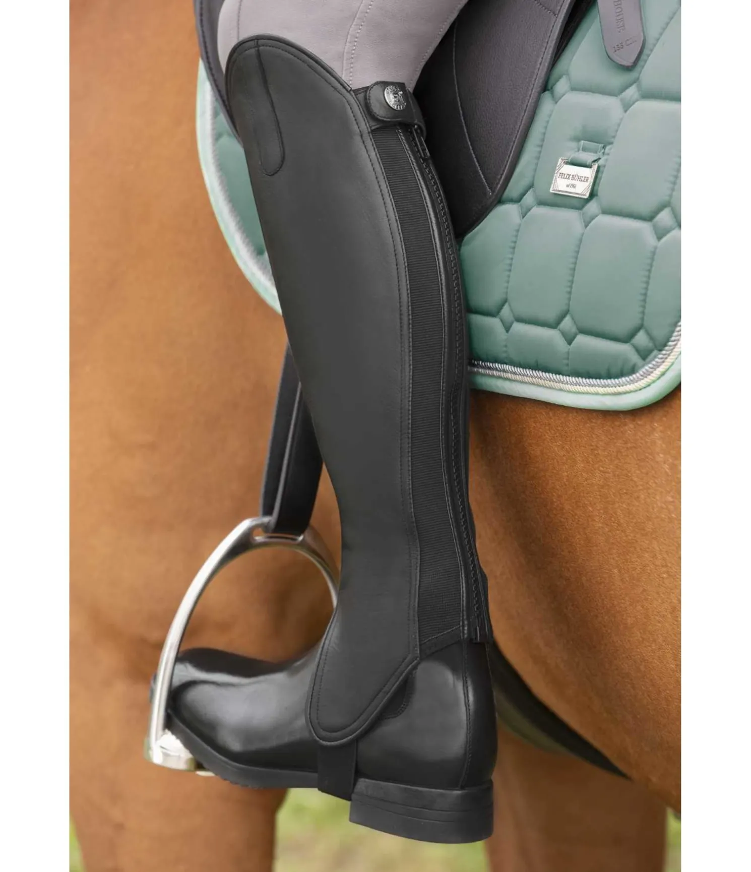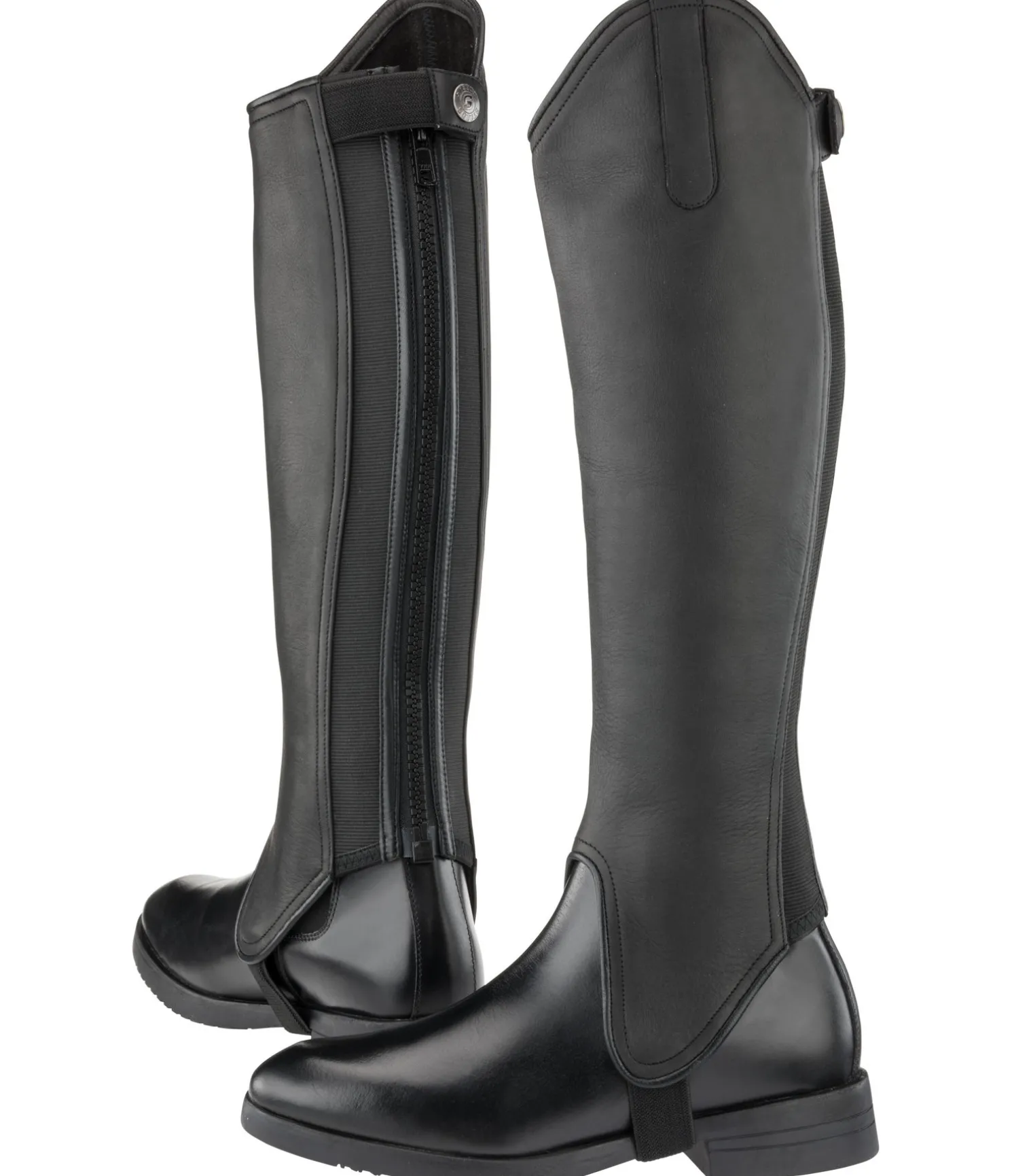 Mini-chaps souples en cuir de vachette antidérapant pour une adhérence optimale entre la jambe et le quartier de la selle, dans un design évoquant des bottes cavalières. Fermeture à glissière YKK solide à l’arrière avec bouton-pression et empiècements élastiques des deux côtés pour un ajustement parfait.