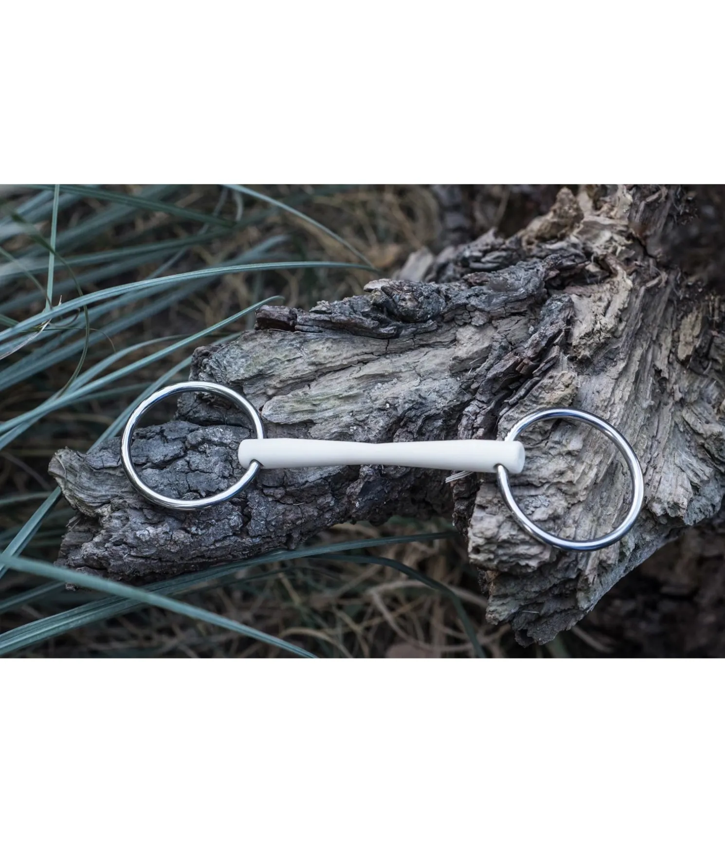 Mors droit innovant, avec canons en caoutchouc souple. Le matériau est non-toxique, sans solvants, résistant aux UV et ne contient pas d’agents assouplissants. Avec coeur en acier qui assure la sécurité. Deux formes possibles : utiliser le côté droit ou le côté légèrement incurvé au besoin. Épaisseur des canons 16 mm, taille de l’anneau 70 mm.