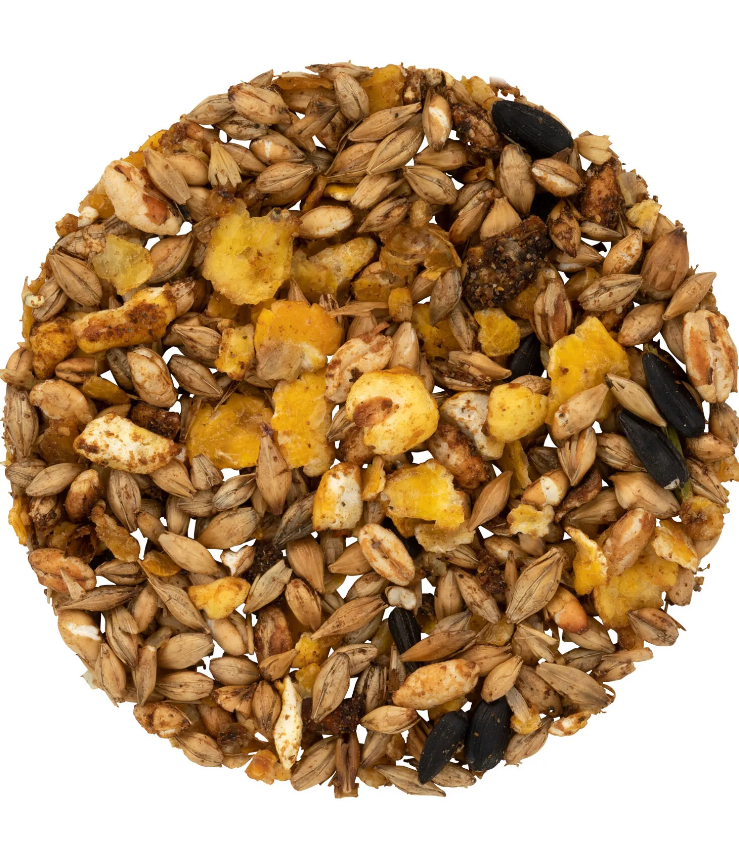 Composition : orge (aplatie, concassée), maïs (aplati, concassé), sirop de betterave sucrière, graines de tournesol, carbonate de calcium, huile de soja (sans OGM), graines de lin, chlorure de sodium, bicarbonate de sodium, son de blé, oxyde de magnésium, phosphate monocalcique, drêche de bière, levure de bière.