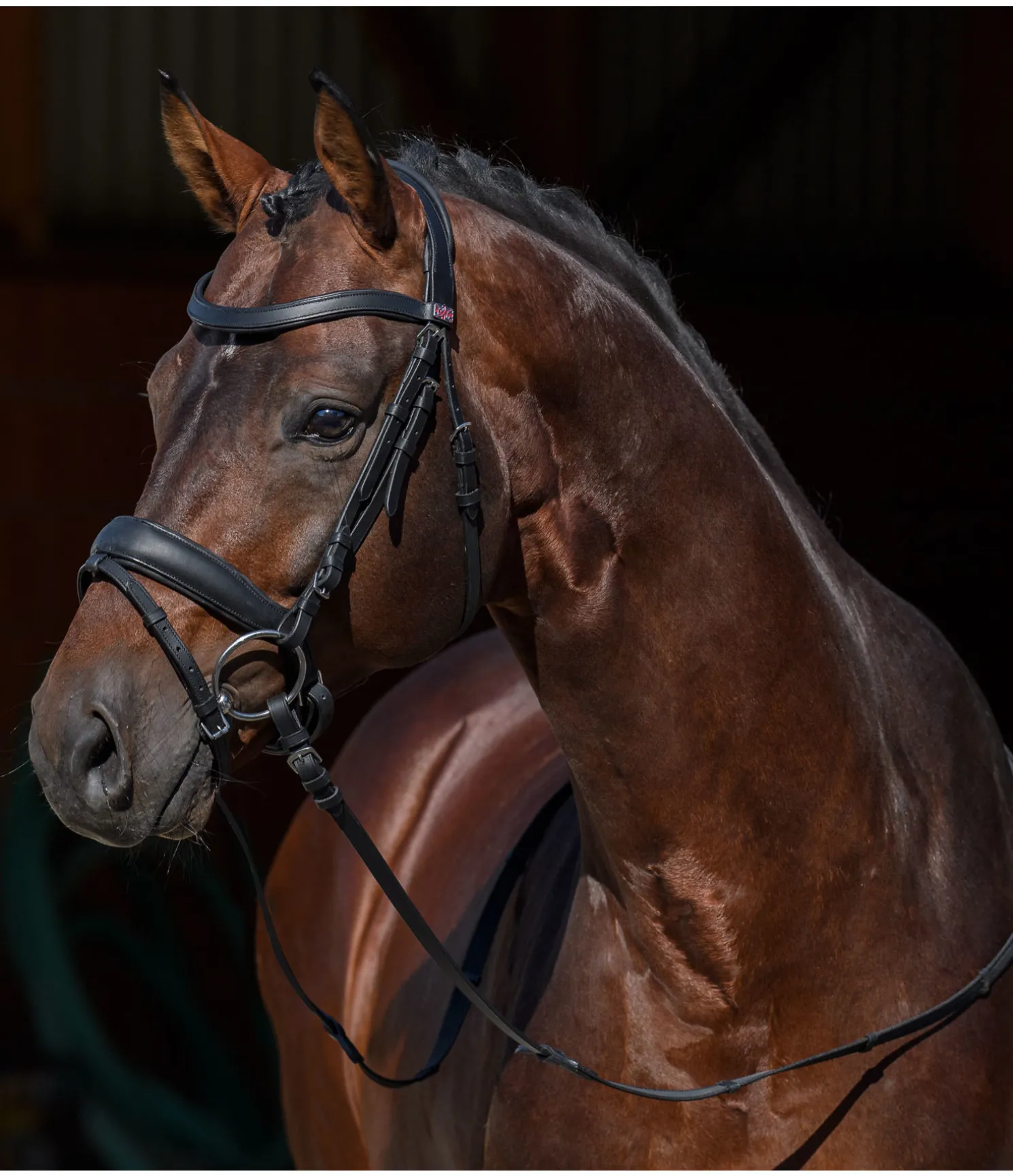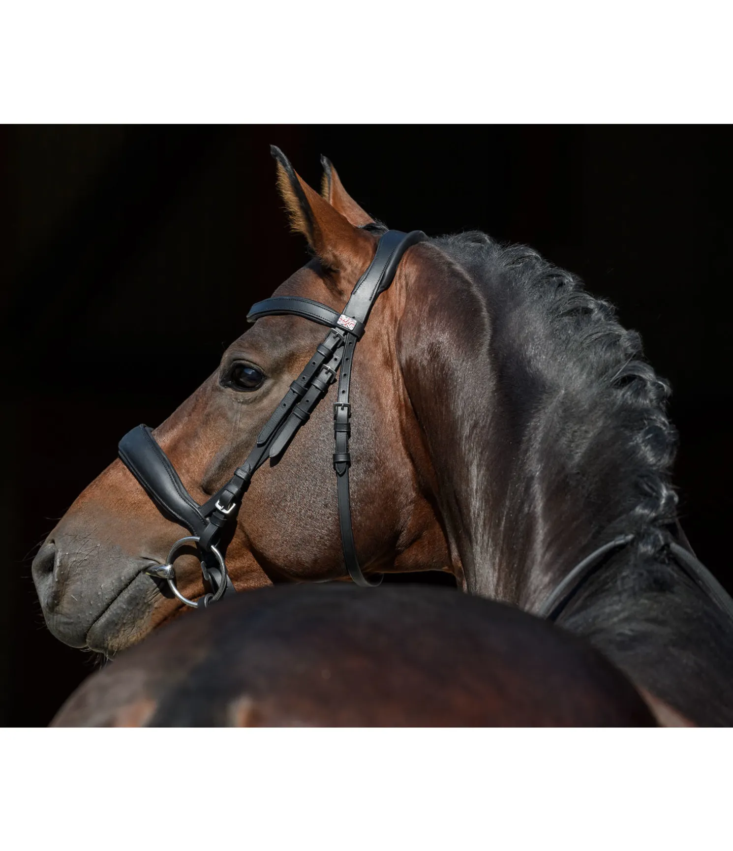 Muserolle suédoise large anatomique avec noseband amovible. La lanière en forme de T permettant de fixer le noseband peut être enlevée lorsqu’elle ne sert pas. Cela permet de ne pas laisser une boucle de cuir disgracieuse lorsque le noseband n’est pas fixé à la muserolle. Muserolle, noseband et pad de menton avec doublure moelleuse en cuir véritable. Cuir gras de qualité, particulièrement souple. Bouclerie argentée. Parfaitement assortie aux autres articles de la série CLARIDGE HOUSE Mix & Match PRO. En combinant les articles de la série CLARIDGE HOUSE Mix & Match PRO, vous pouvez créer le bridon de vos rêves.