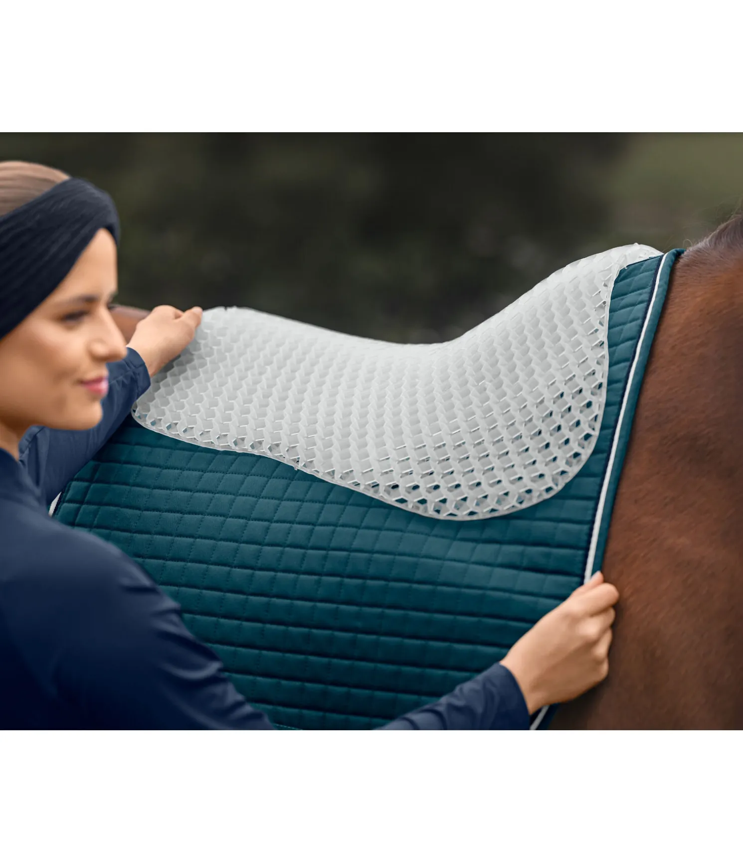 Pad en gel antidérapant, de forme anatomique, pour soulager la pression au niveau du garrot et sur la zone d’appui de la selle. Avec trous d’aération pour une respirabilité optimale. Grâce à la double couche alvéolée, ce pad est encore plus adapté pour soulager la pression et permet une circulation permanente de l’air. Longueur du dos 57 cm, hauteur 1,8 cm.