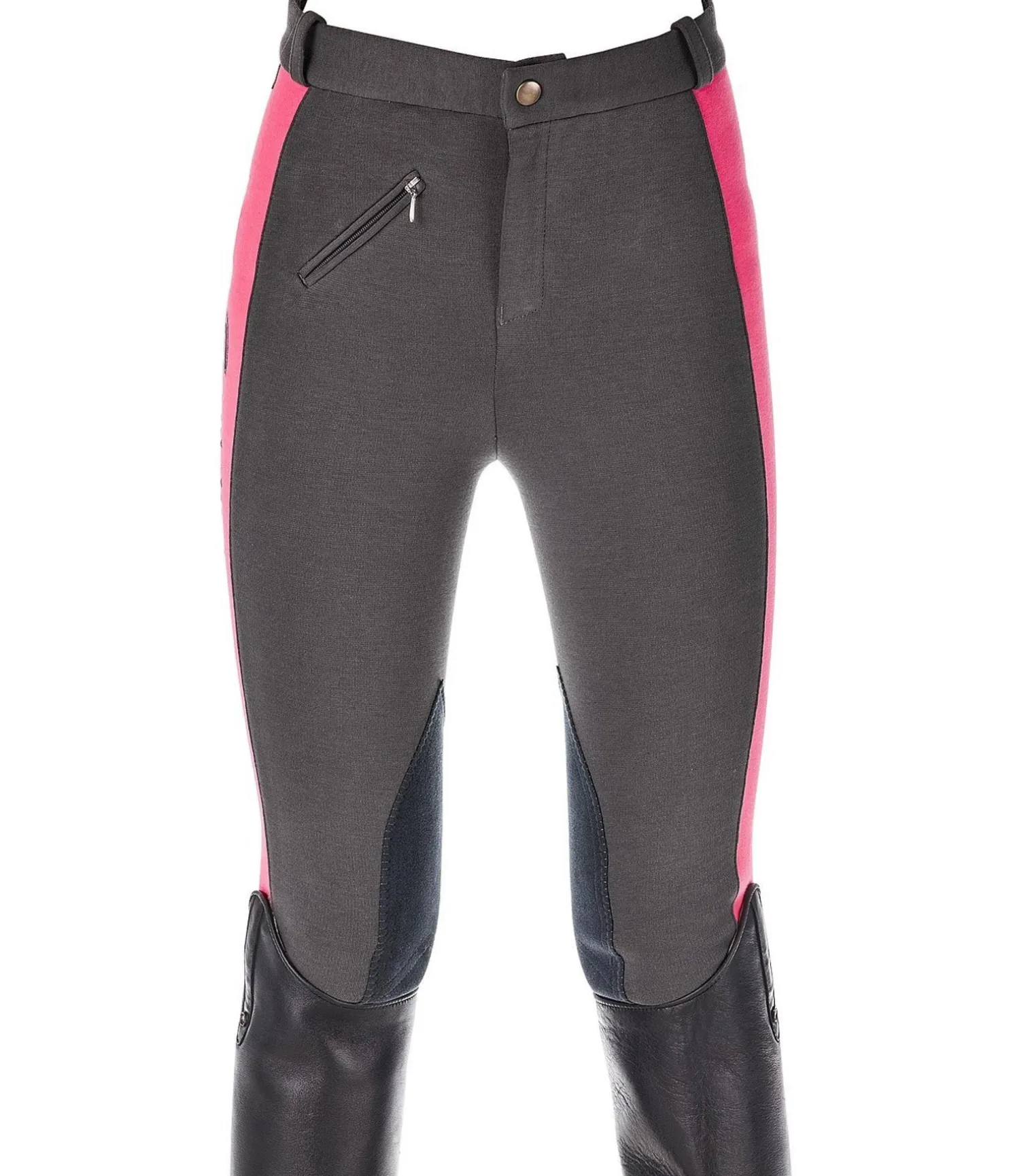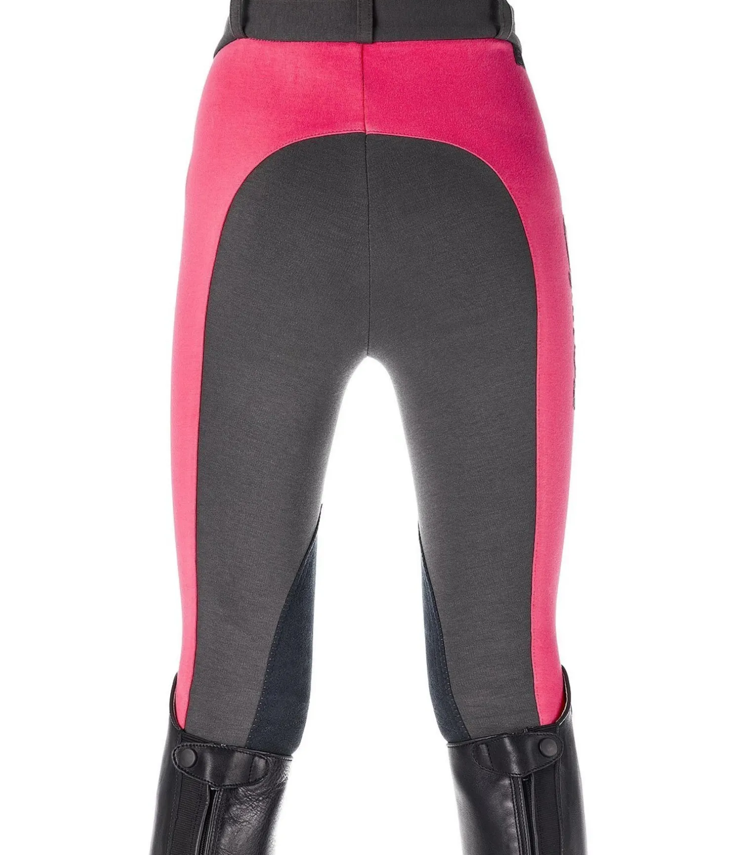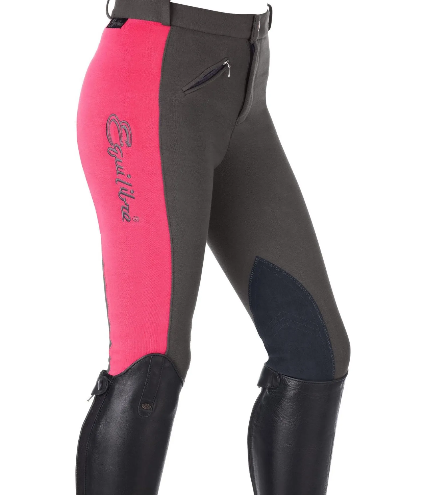 Pantalon d’équitation bicolore à basanes. Broderie de couleur contrastante sur la cuisse. 92 % coton, 8 % élasthanne.
