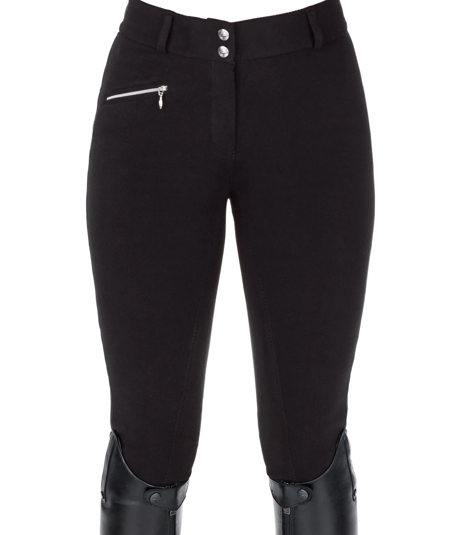 Pantalon d’équitation basique avec fond intégral en synthétique. Matière très extensible et extrêmement douce. 1 poche zippée avant. Large ceinture élastiquée avec 2 boutons. Bas de jambe extensible, sans patte auto-agrippante. 95 % coton, 5 % élasthanne.