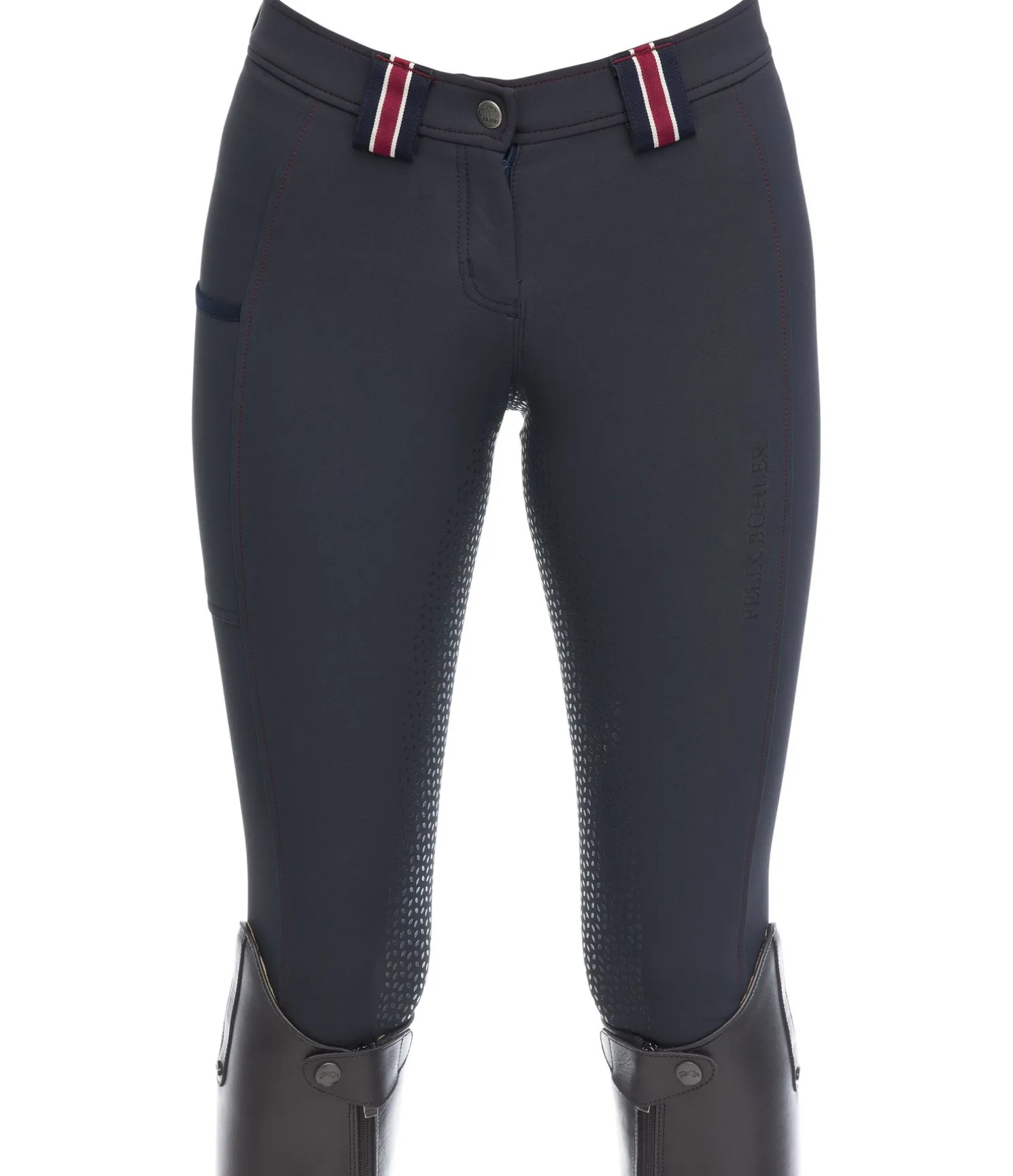 Pantalon d’équitation adapté à toutes les saisons. Fond intégral Grip siliconé pour une parfaite adhérence à la selle. Bas de jambe extensible sans patte auto-agrippante. Aucune couture au niveau des genoux. Matière extensible, déperlante et respirante. Résistant à la déchirure et facile d’entretien. Grande poche pour téléphone portable sur la jambe, une poche zippée discrète arrière. Ceinture élastiquée avec passants à rayures de couleur contrastante. 93 % nylon, 7 % élasthanne.