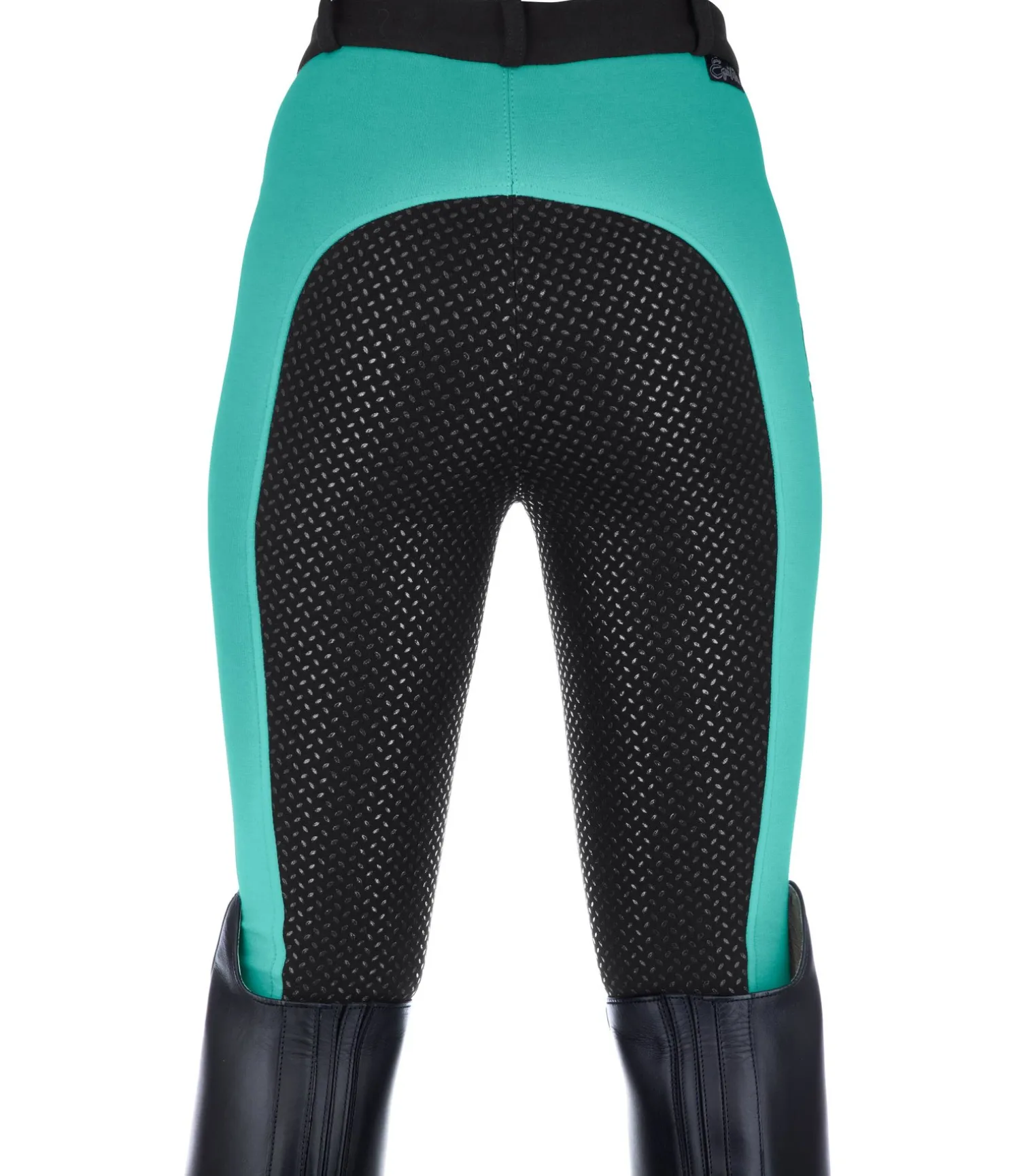 Pantalon d’équitation bicolore. Coton mélangé doux. Fond intégral en silicone idéal pour les cavaliers débutants. Ceinture élastiquée avec passants. Bas de jambe extensible sans patte auto-agrippante pour plus de confort. 1 poche avant zippée. Jolie broderie tendance sur la cuisse droite. 95 % coton, 5 % élasthanne.