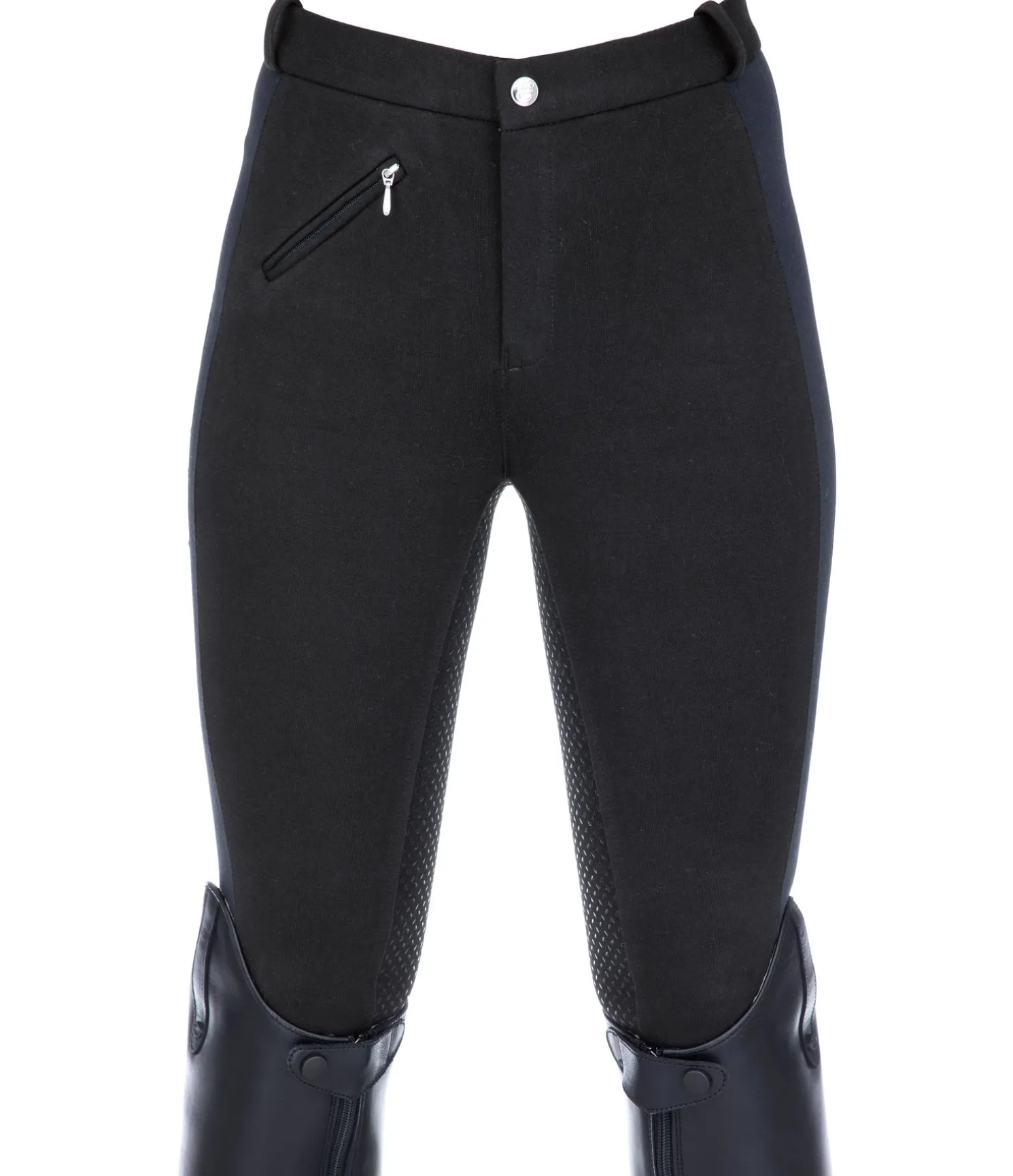 Pantalon d’équitation bicolore. Coton mélangé doux. Fond intégral en silicone idéal pour les cavaliers débutants. Ceinture élastiquée avec passants. Bas de jambe extensible sans patte auto-agrippante pour plus de confort. 1 poche avant zippée. Jolie broderie tendance sur la cuisse droite. 95 % coton, 5 % élasthanne.