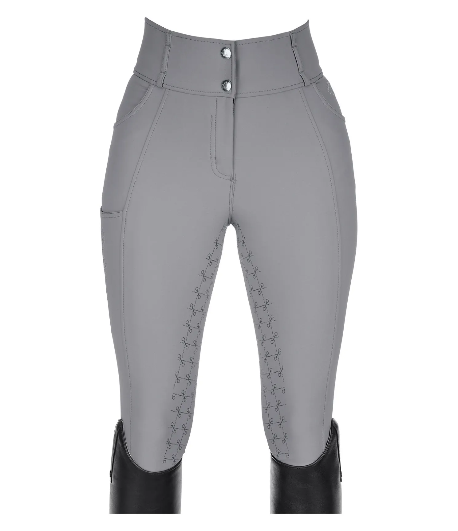 Pantalon d’équitation sportswear et extensible, à fond intégral grip en silicone avec motifs de mors. Matière déperlante, respirante et à séchage rapide. Broderie Felix Bühler sur la jambe. Poche arrière zippée et poche pour téléphone portable sur la cuisse. Deux poches avant. Ceinture à passants extra large élastiquée avec 2 boutons. Aucune couture aux genoux. Bas de jambe extensible en stretch. 89 % nylon, 11 % élasthanne.