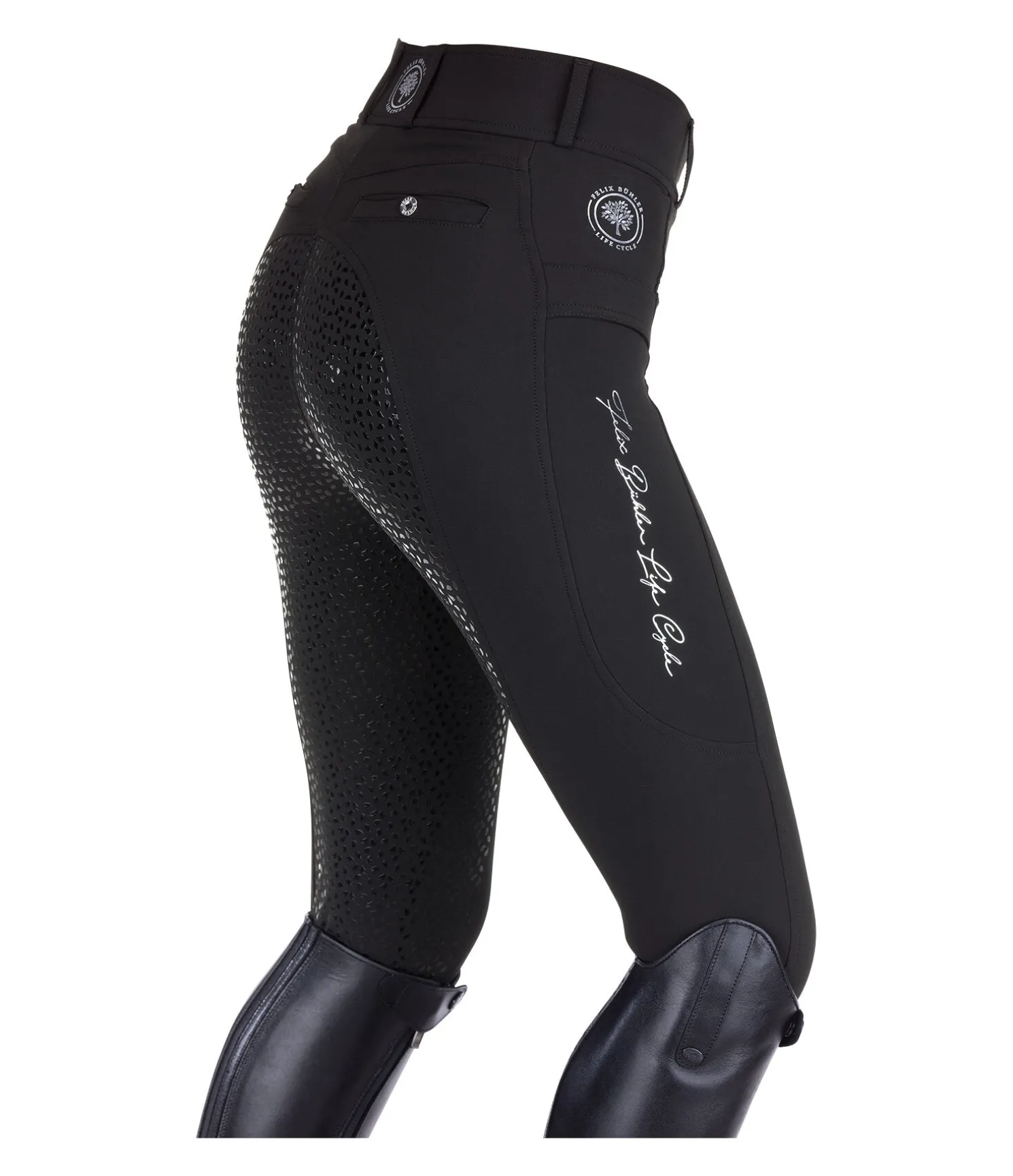 Durable et confortable ! Pantalon d’équitation à fond intégral grip en silicone extrêmement agréable à porter. Conçu principalement en stretch recyclé de grande qualité. Imprimés Felix Bühler Life Cycle. Matière respirante. Séchage rapide. 2 poches arrière et 2 poches latérales pour téléphone portable, dont une avec fermeture à glissière. Ceinture extra large avec 2 boutons. Aucune couture au niveau des genoux. Bas de jambe extensible en stretch. 89 % polyester, 11 % élasthanne.