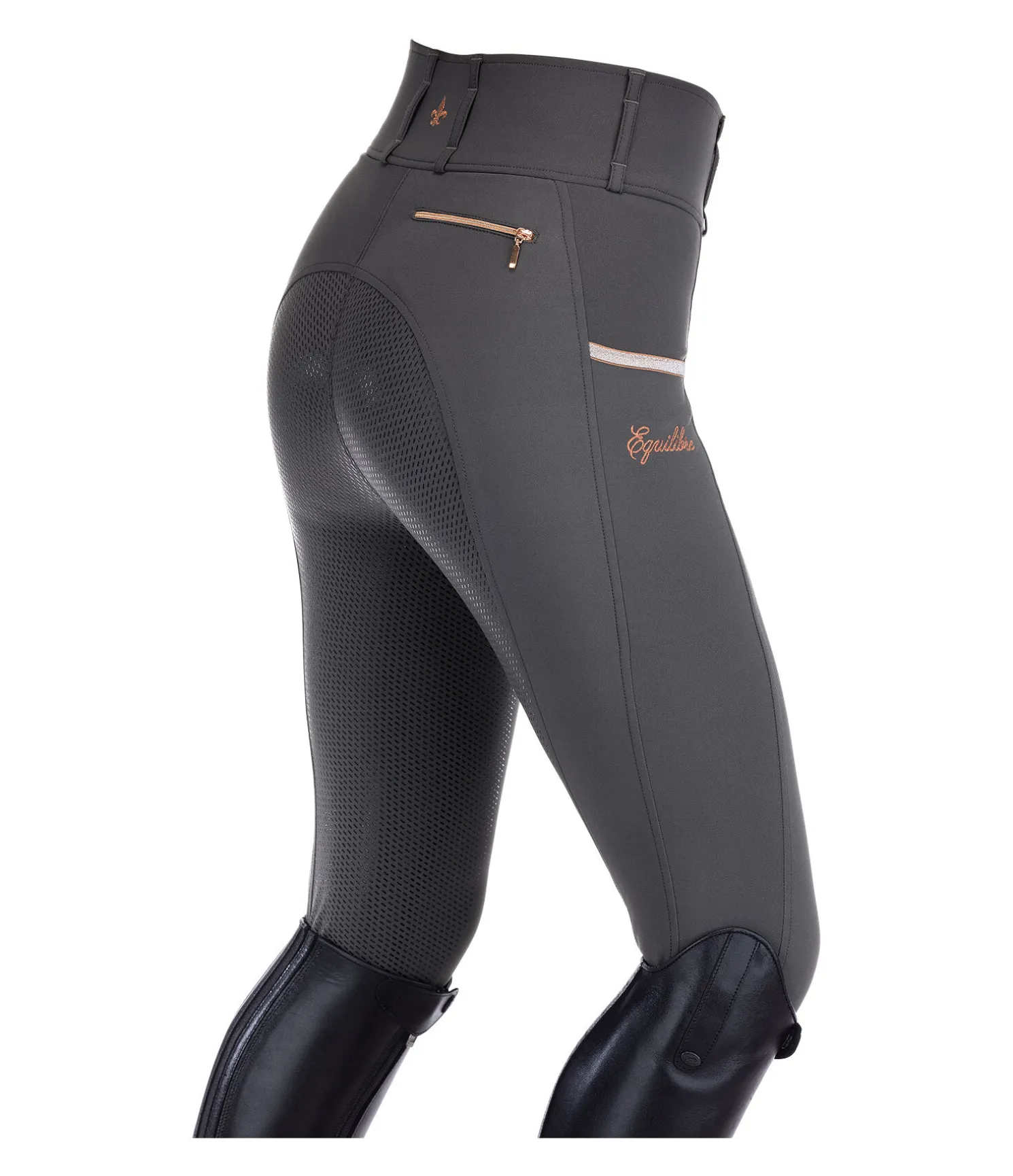 Super rapport qualité-prix ! Pantalon d’équitation technique avec fond intégral grip en silicone. Matière stretch respirante. Séchage rapide. 1 poche arrière zippée.1 poche latérale pour téléphone portable ornée d’une bande scintillante. Ceinture élastiquée extra large avec 2 boutons. Aucune couture aux genoux. Bas de jambe extensible. 88 % nylon, 12 % élasthanne.