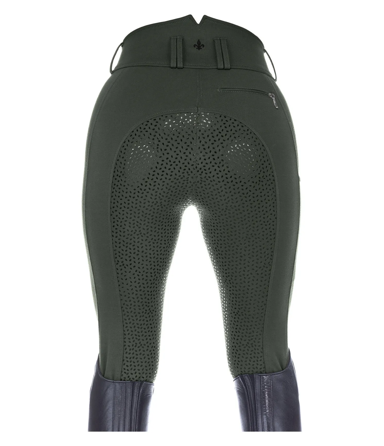 Pantalon d’équitation taille haute. Matière souple super confortable et extensible. Fond intégral grip en silicone. Aucune couture au niveau des genoux. Une poche latérale pour téléphone portable et une poche arrière zippée. Broderie sur l’avant et l’arrière. Bas de jambe extensible sans patte auto-agrippante. 68 % viscose, 27 % nylon, 5 % élasthanne.