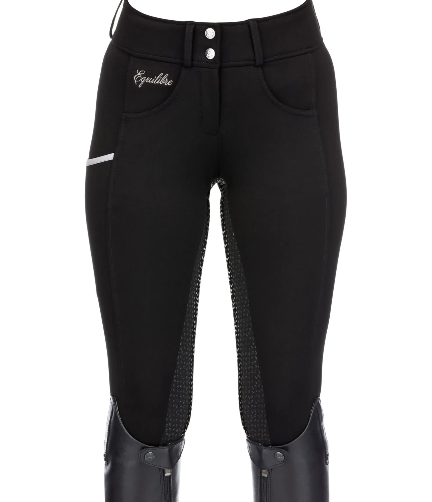 Pantalon d’équitation taille haute. Matière souple super confortable et extensible. Fond intégral grip en silicone. Aucune couture au niveau des genoux. Une poche latérale pour téléphone portable et une poche arrière zippée. Broderie sur l’avant et l’arrière. Bas de jambe extensible sans patte auto-agrippante. 68 % viscose, 27 % nylon, 5 % élasthanne.