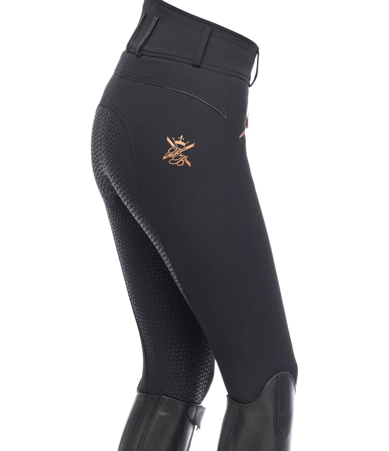 Élégant pantalon d’équitation. Fond intégral Grip siliconé pour une tenue parfaite en selle. Taille haute. Bas de jambe extensible sans patte auto-agrippante. Aucune couture au niveau des genoux. Matière extensible respirante, déperlante, résistante et facile d’entretien. Deux poches avant zippées. Surpiqûres de couleur contrastante. Ceinture élastiquée. Jolis imprimés Felix Bühler. 93 % nylon, 7 % élasthanne.