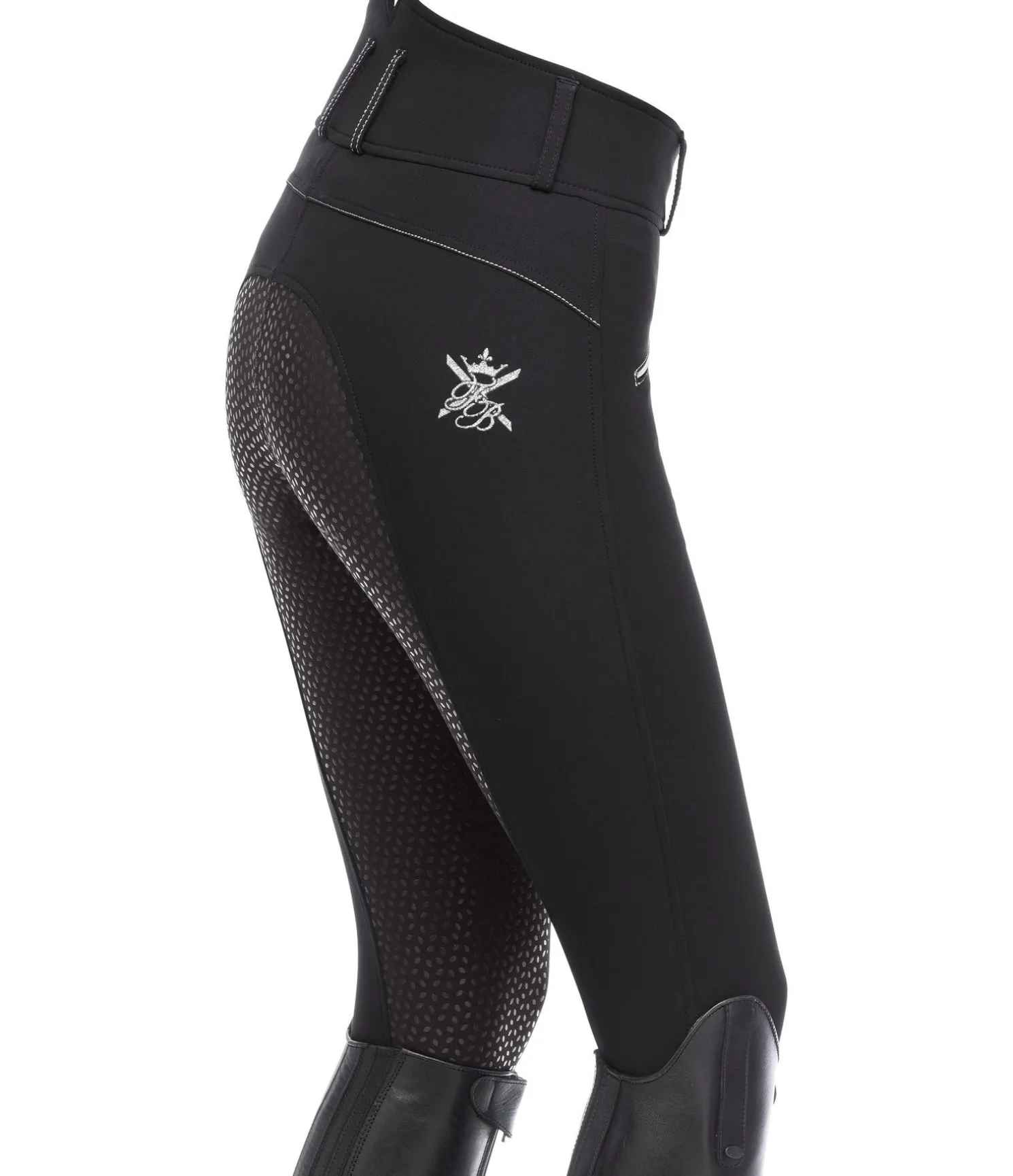 Élégant pantalon d’équitation. Fond intégral Grip siliconé pour une tenue parfaite en selle. Taille haute. Bas de jambe extensible sans patte auto-agrippante. Aucune couture au niveau des genoux. Matière extensible respirante, déperlante, résistante et facile d’entretien. Deux poches avant zippées. Surpiqûres de couleur contrastante. Ceinture élastiquée. Jolis imprimés Felix Bühler. 93 % nylon, 7 % élasthanne.