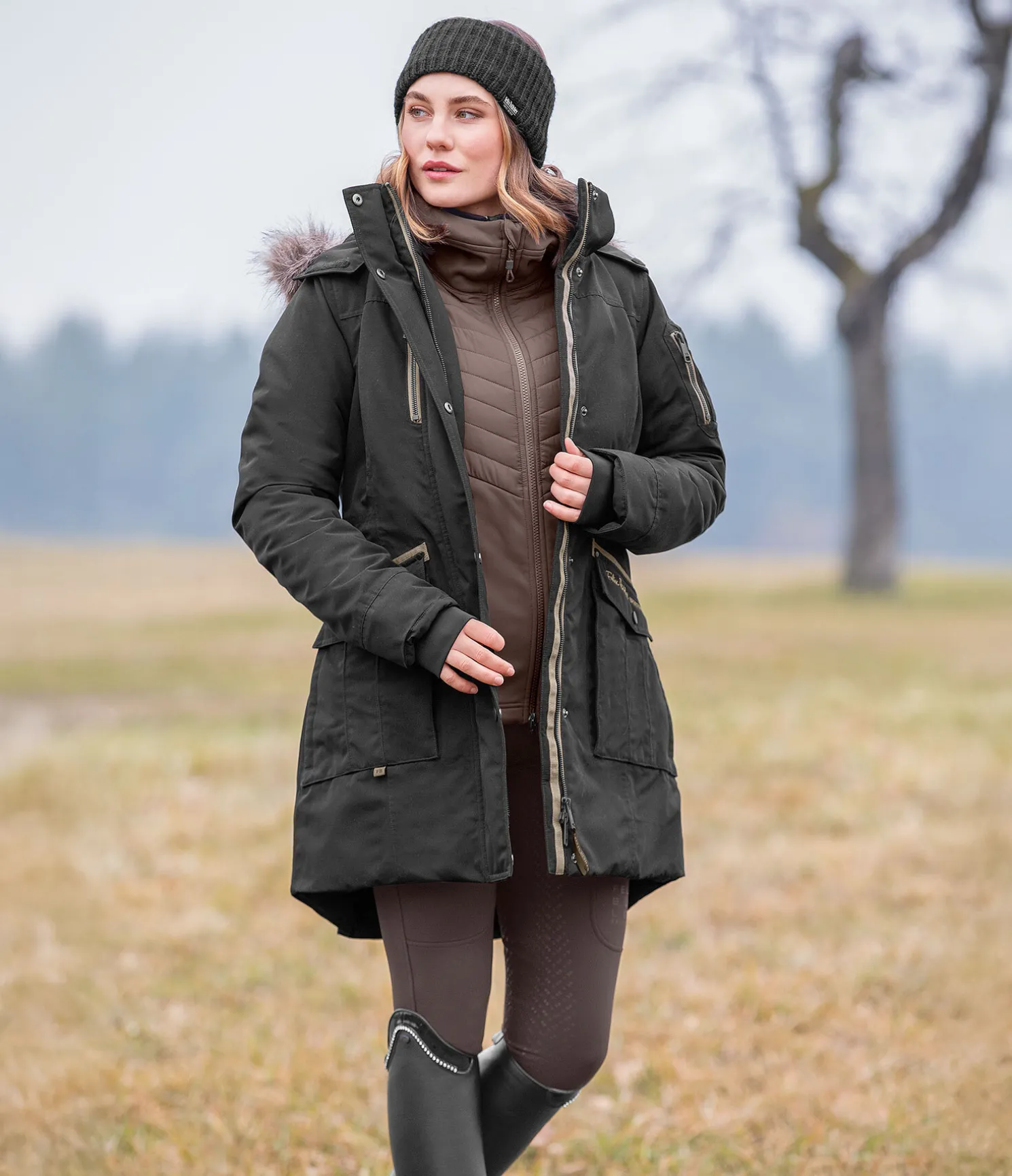 Parka d’équitation très chaude, solide et résistante aux intempéries. Capuche réglable et amovible par fermeture à glissière, pouvant être fixée dans le dos. Sa bordure en fausse « fourrure » est elle aussi amovible. Imperméable (10.000 mm), coupe-vent et respirante. Garnissage matelassé chaud en imitation duvet doux. 2 grandes poches à rabat avec poche latérale. 1 poche de poitrine zippée, 1 poche zippée sur la manche, 1 poche intérieure zippée, fermeture à glissière double sens dissimulée devant, 2 fentes cavalières zippées avec sous-patte à l’arrière, cordon de serrage à la taille, bas des manches avec finition bord-côte coupe-vent. Broderie et badge Felix Bühler. 100 % polyester.
