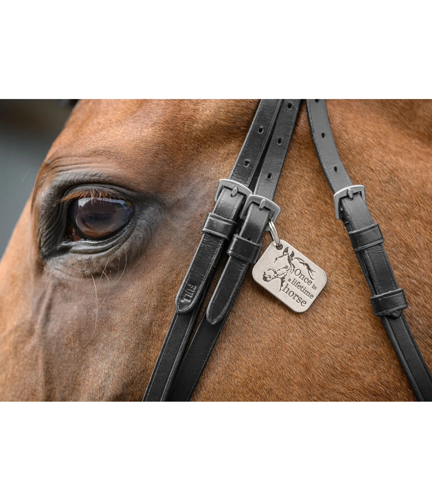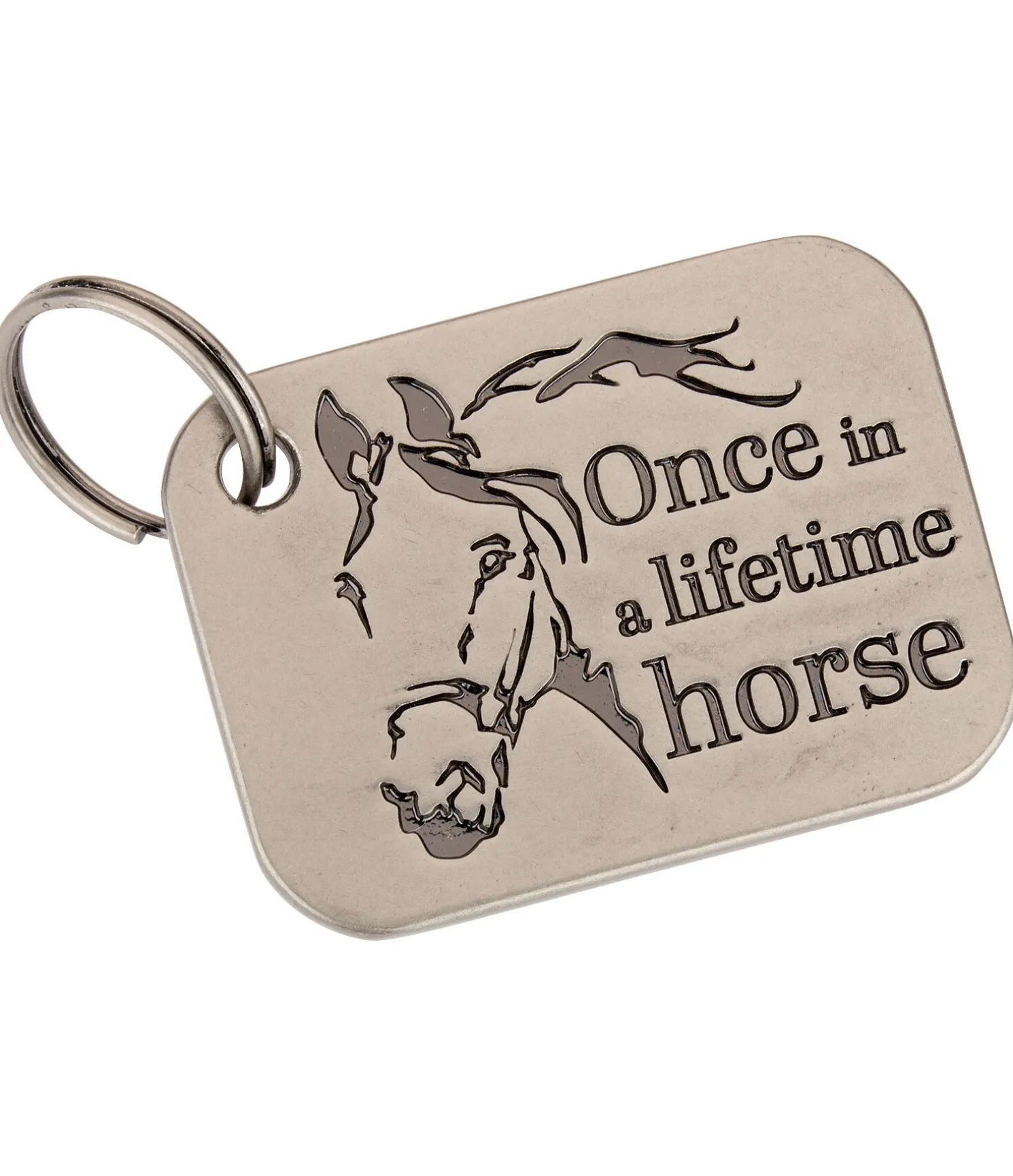 Pendentif porte-bonheur rectangulaire pour les licols, bridons, colliers de chasses et autres avec gravure « Once in a lifetime horse » au recto. Verso avec espace blanc pour inscrire le nom du cheval ou un numéro de téléphone au marqueur indélébile. Avec anneau pour une installation rapide. Inoxydable.
