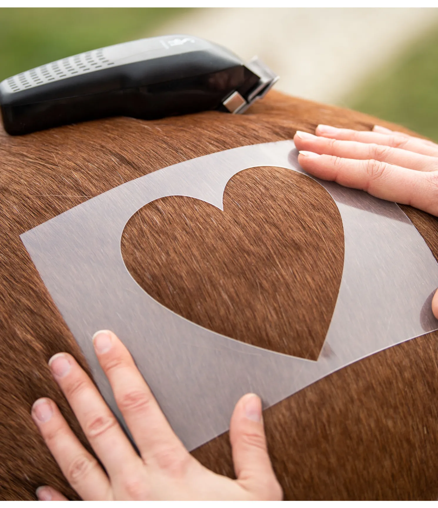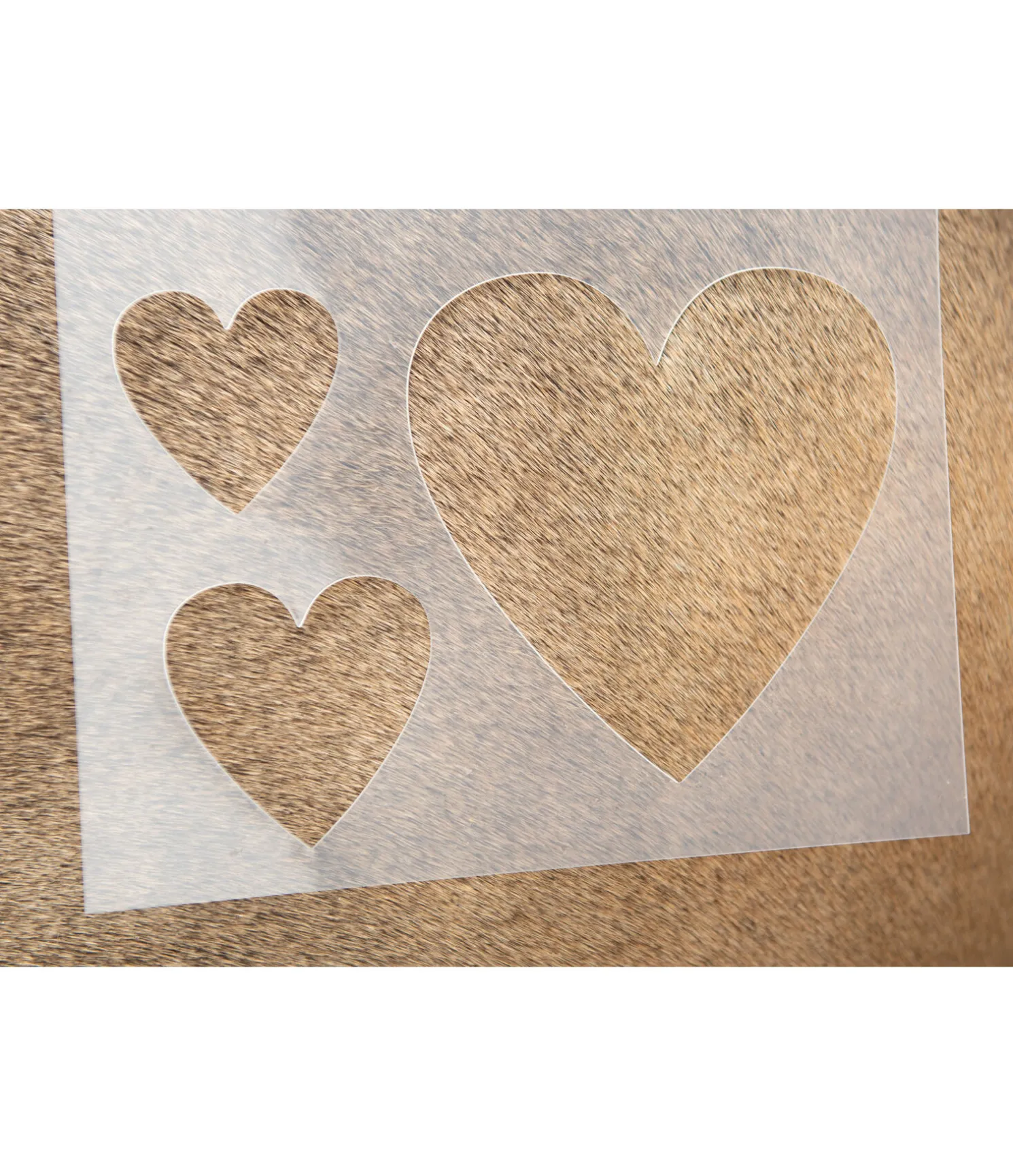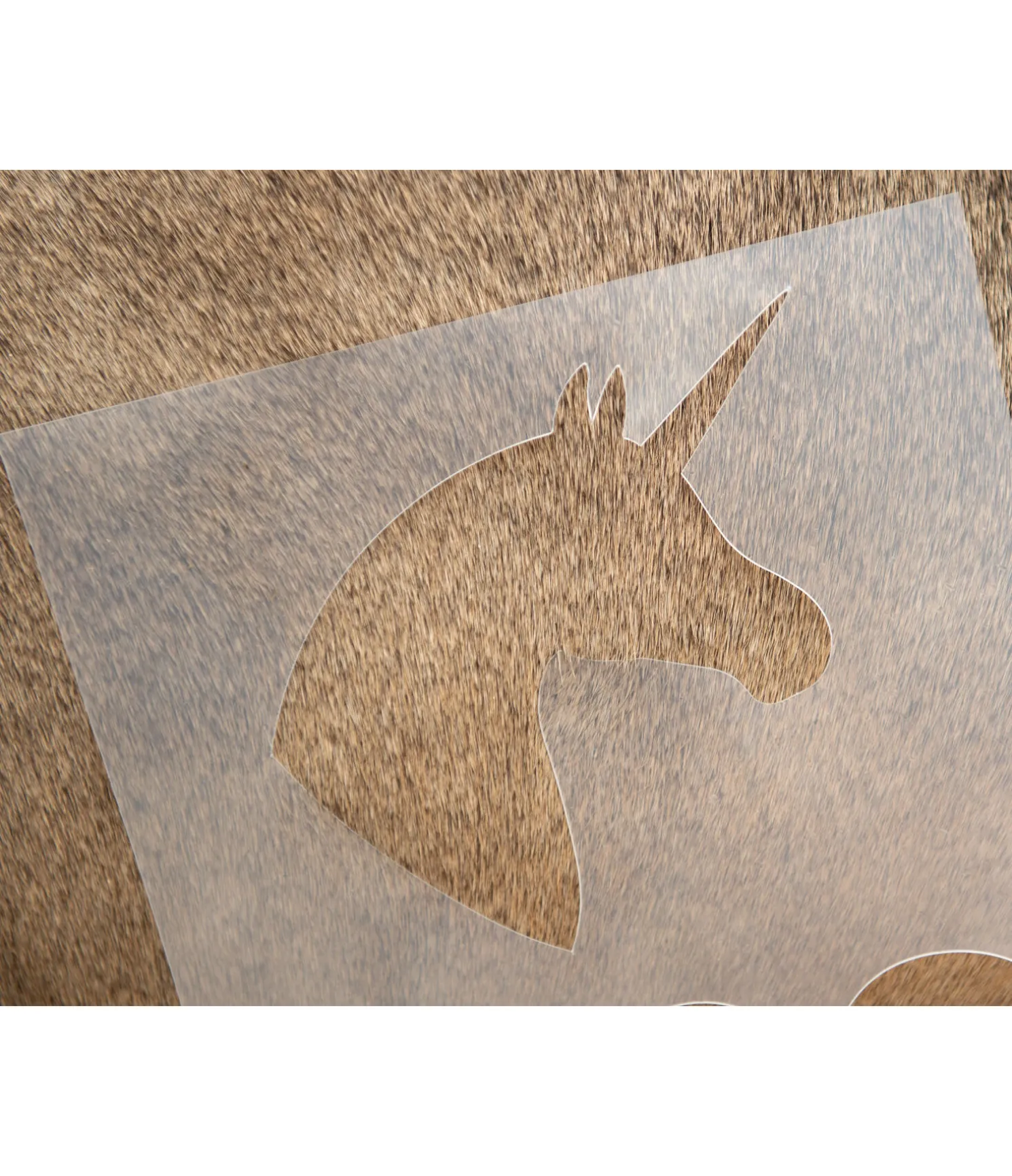 Pochoirs pour tondre, brosser ou taguer des motifs. En matière synthétique de haute qualité. Réutilisables et lavables. Le kit comprend 2 pochoirs: coeur de différentes tailles de 5 cm à 12 cm, licorne, trèfle à quatre feuilles et carotte.