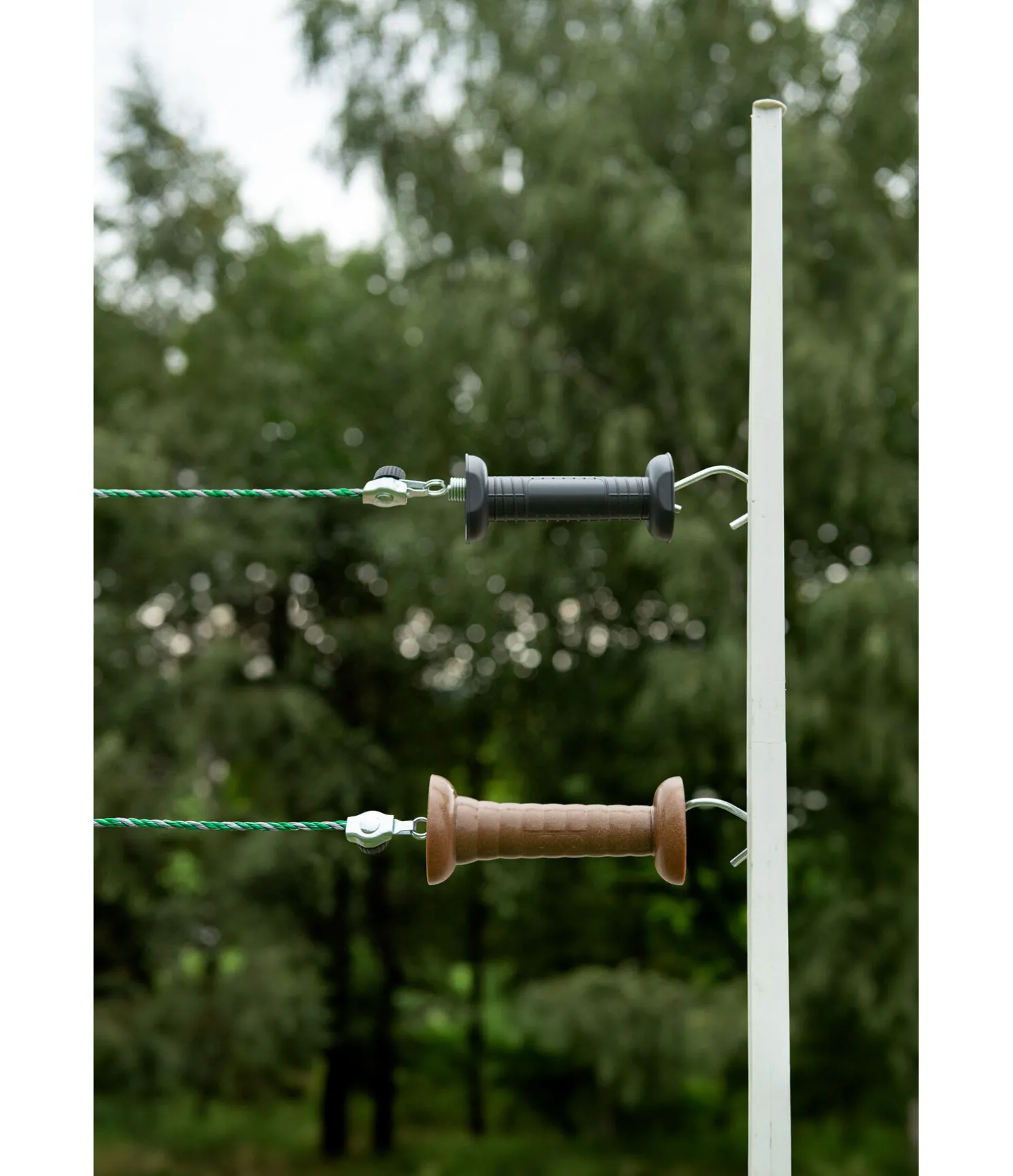 Poignée de clôture en matière plastique recyclée de haute qualité. Crochet et ressort galvanisés. Ressort de traction simple.