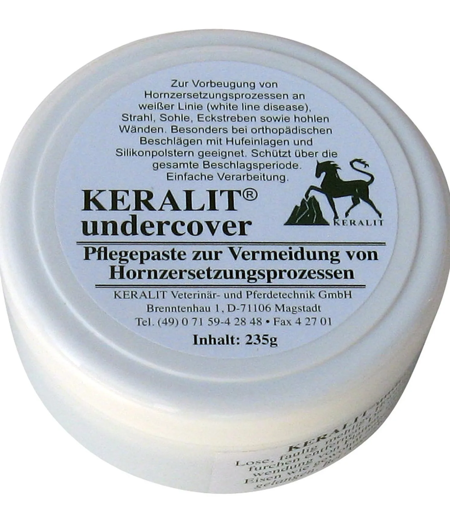 KERALIT Undercover est une pommade fortement adhérente, composée d’épices végétales tels que le curcuma et de minéraux à forte dispersion tels que les extraits d’écorce de diverses essences d’arbres, par exemple l’écorce de chêne. La base même de la pommade assure une libération régulière des principes actifs sur 7 à 8 semaines. Keralit Undercover est spécialement développée pour prévenir et traiter le processus de décomposition de la corne sur les lignes blanches, les lacunes médianes et latérales, la sole et la fourchette. Dangereux. Respecter les précautions d’emploi.