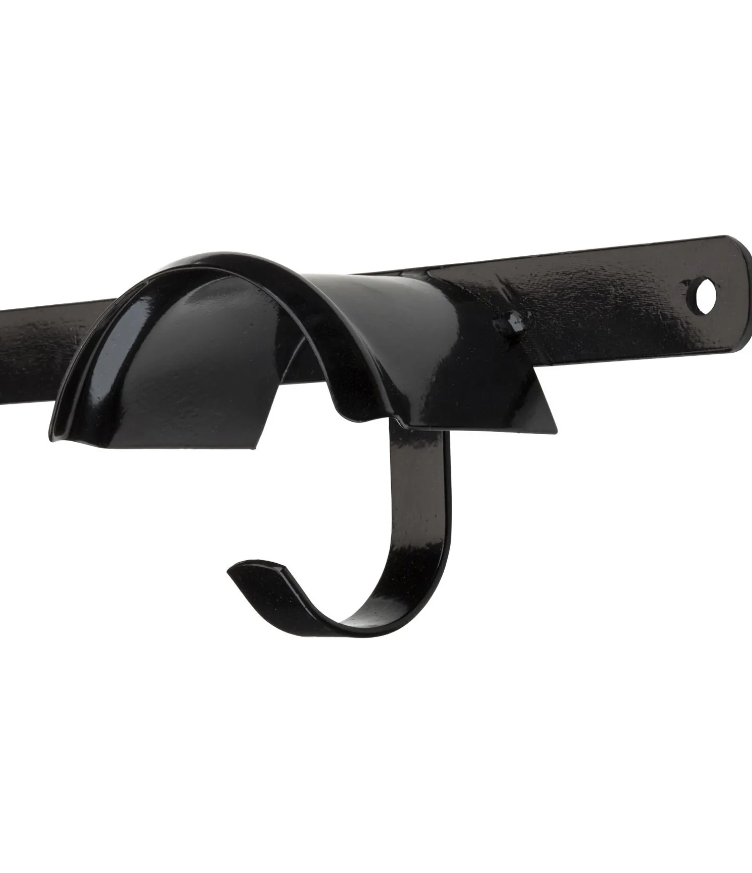 Très beau porte-brides en métal de grande qualité avec 5 supports et 5 crochets. N’abime pas les têtières de vos bridons et licols grâce à la large surface de contact, la courbure du métal évite au harnachement de glisser. 4 trous assurent une fixation simple et sûre. Dimensions : 1 m.