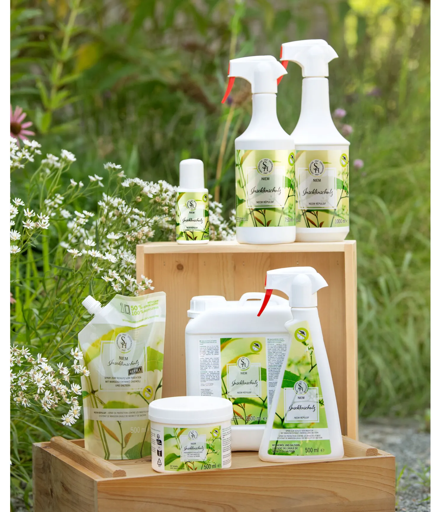 Spray de protection contre les insectes à base d’extrait de margousier et de saltidine (icaridine). Celui-ci est obtenu comme huile végétale par pression à froid des graines et des drupes du neem. Par conséquent, son utilisation est particulièrement recommandée pour les chevaux à la peau sensible. Malgré le goût amer, qui est censé couper l’appétit des insectes, l’odeur est généralement perçue comme très agréable.