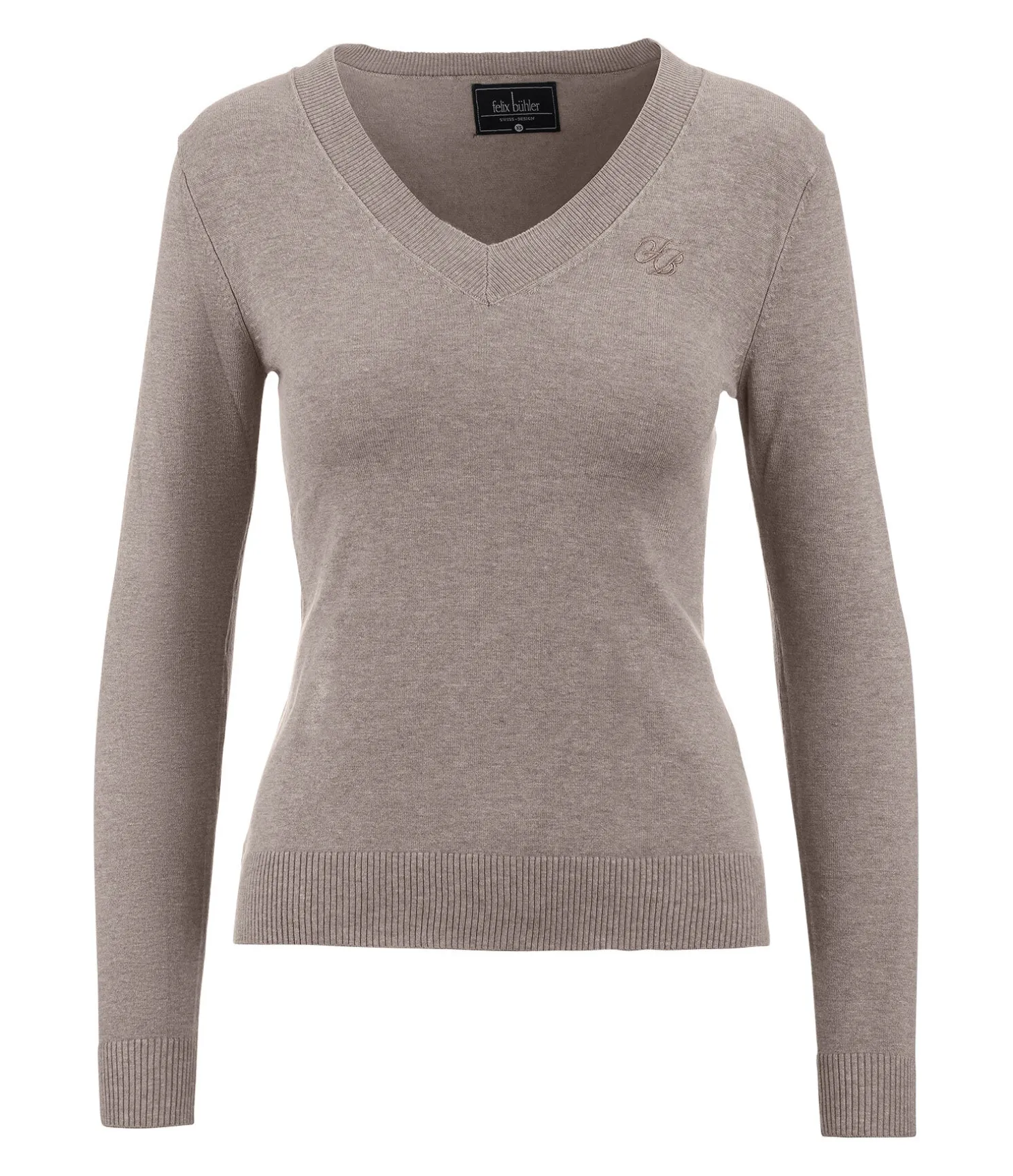 Pull classique avec col en V. Matière douce. Discrète broderie Felix Bühler sur la poitrine. Finition bord-côte à la taille, au col et aux poignets. 80 % viscose, 20 % nylon.