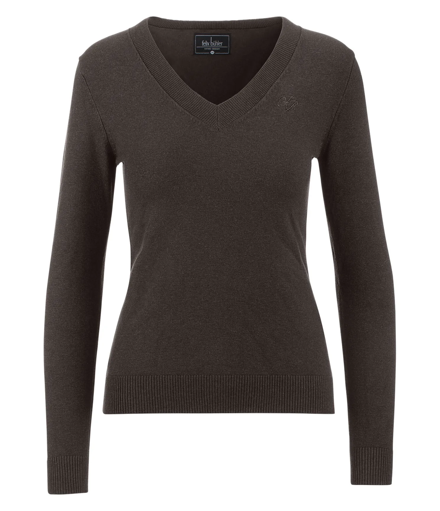 Pull classique avec col en V. Matière douce. Discrète broderie Felix Bühler sur la poitrine. Finition bord-côte à la taille, au col et aux poignets. 80 % viscose, 20 % nylon.