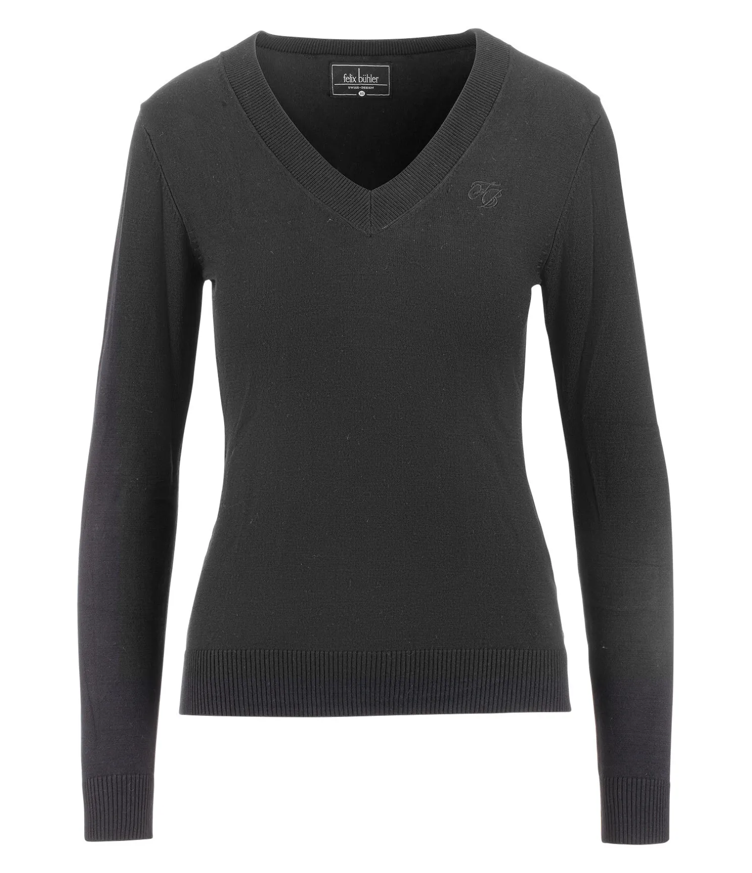Pull classique avec col en V. Matière douce. Discrète broderie Felix Bühler sur la poitrine. Finition bord-côte à la taille, au col et aux poignets. 80 % viscose, 20 % nylon.