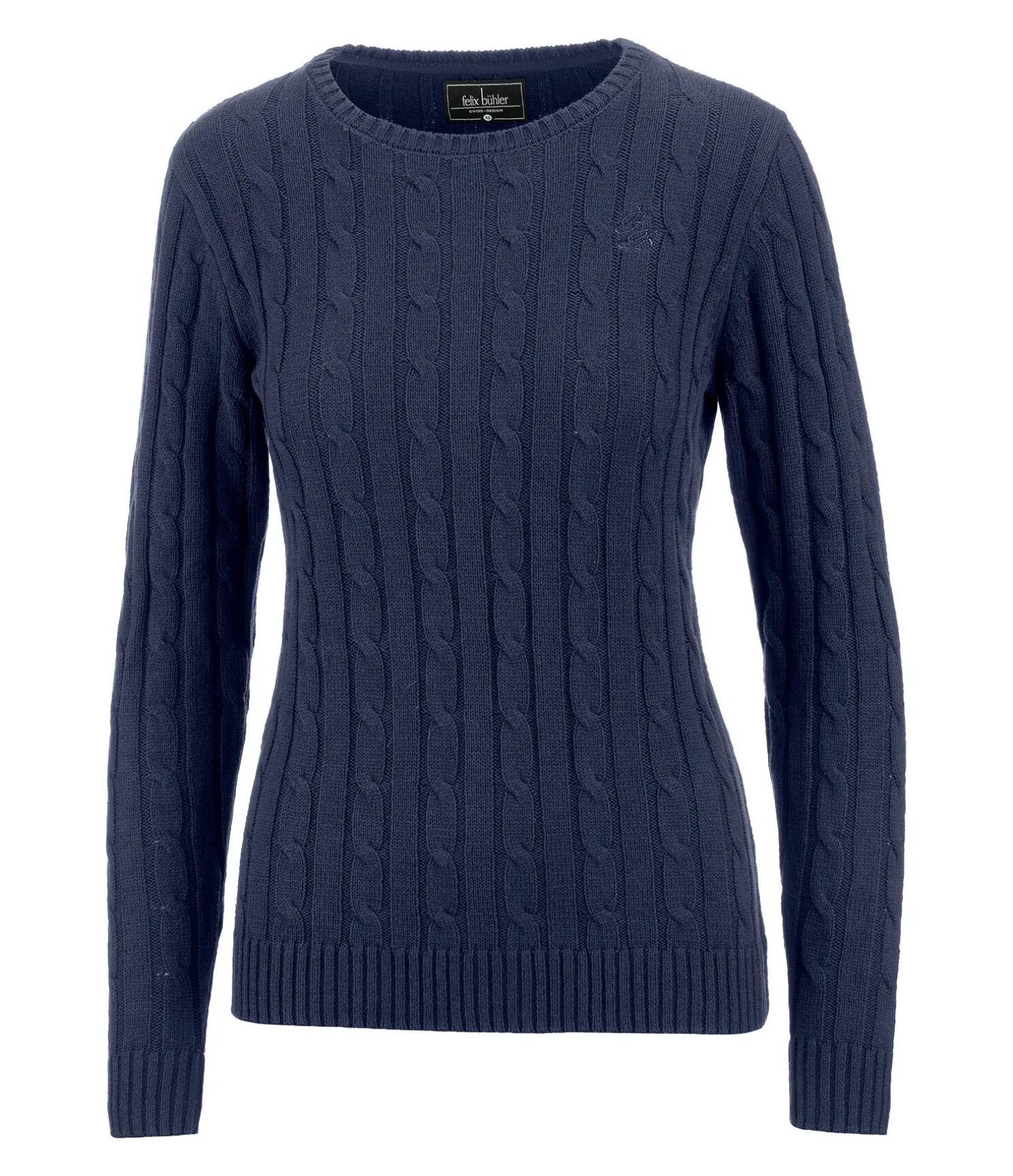 Pull-over à col rond classique et doux en tricot torsadé. Broderie Felix Bühler sur la poitrine. Bordure côtelée en bas des manches et à la taille. 60 % coton, 40 % polyacrylique.