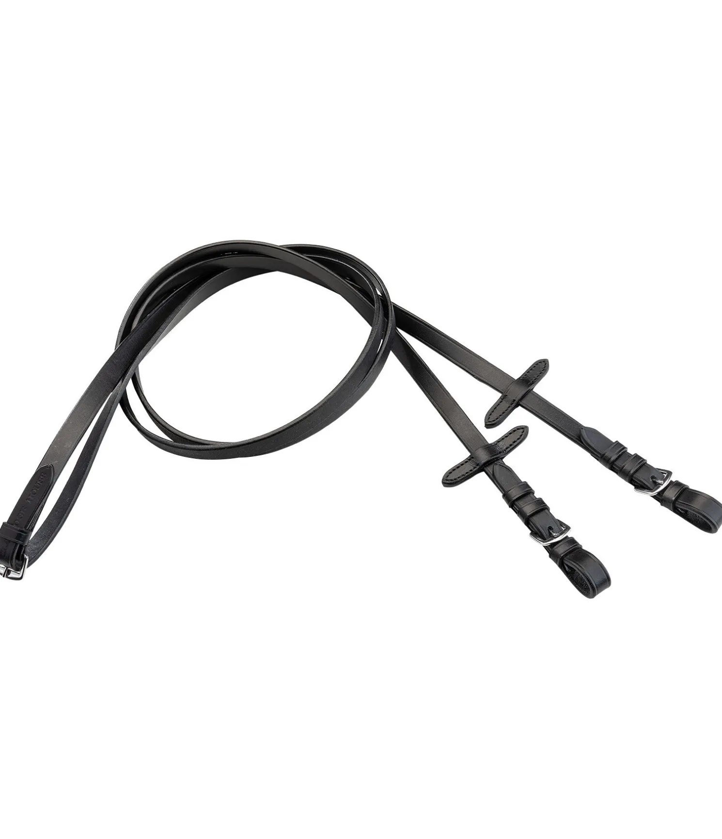 Rênes classiques et fines en cuir véritable. Fabriquées en cuir gras de qualité, particulièrement souple. Avec arrêtoirs de martingale et bouclerie argentée en acier inoxydable. 290 x 1,7 cm.