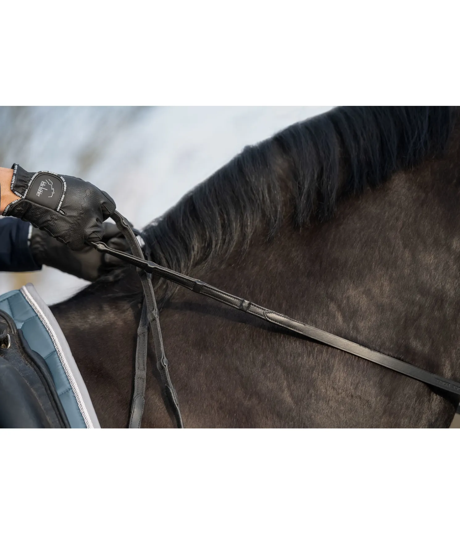 Rênes en cuir avec arrêtoirs Soft-Stops et revêtement en caoutchouc antidérapant permettant une bonne prise en main. Avec arrêtoirs de martingale. Bouclerie argentée. 290 x 1,4 cm.