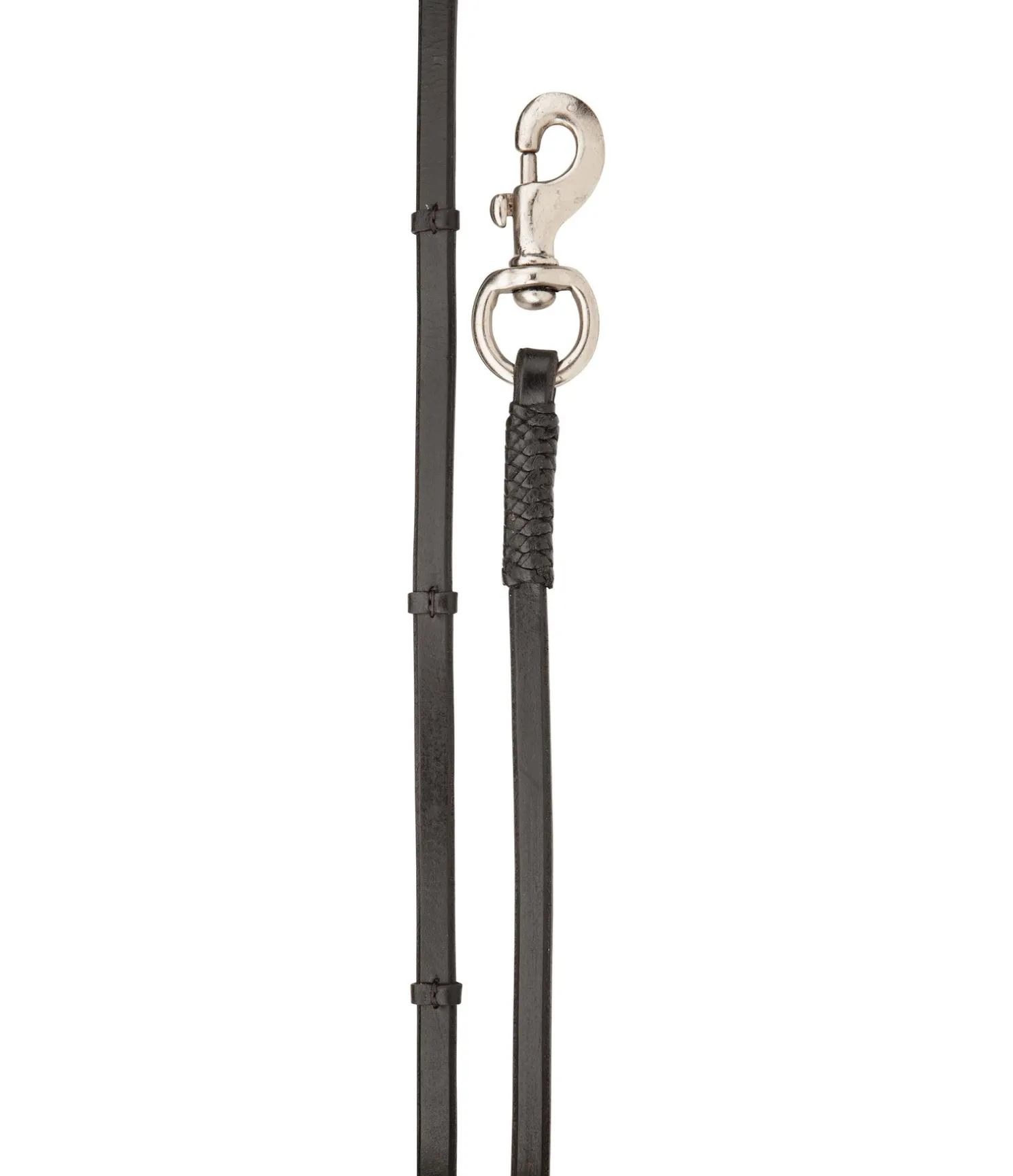 Rênes fines en cuir de qualité, avec embouts tressés à la main et arrêtoirs cousus. 250 cm.