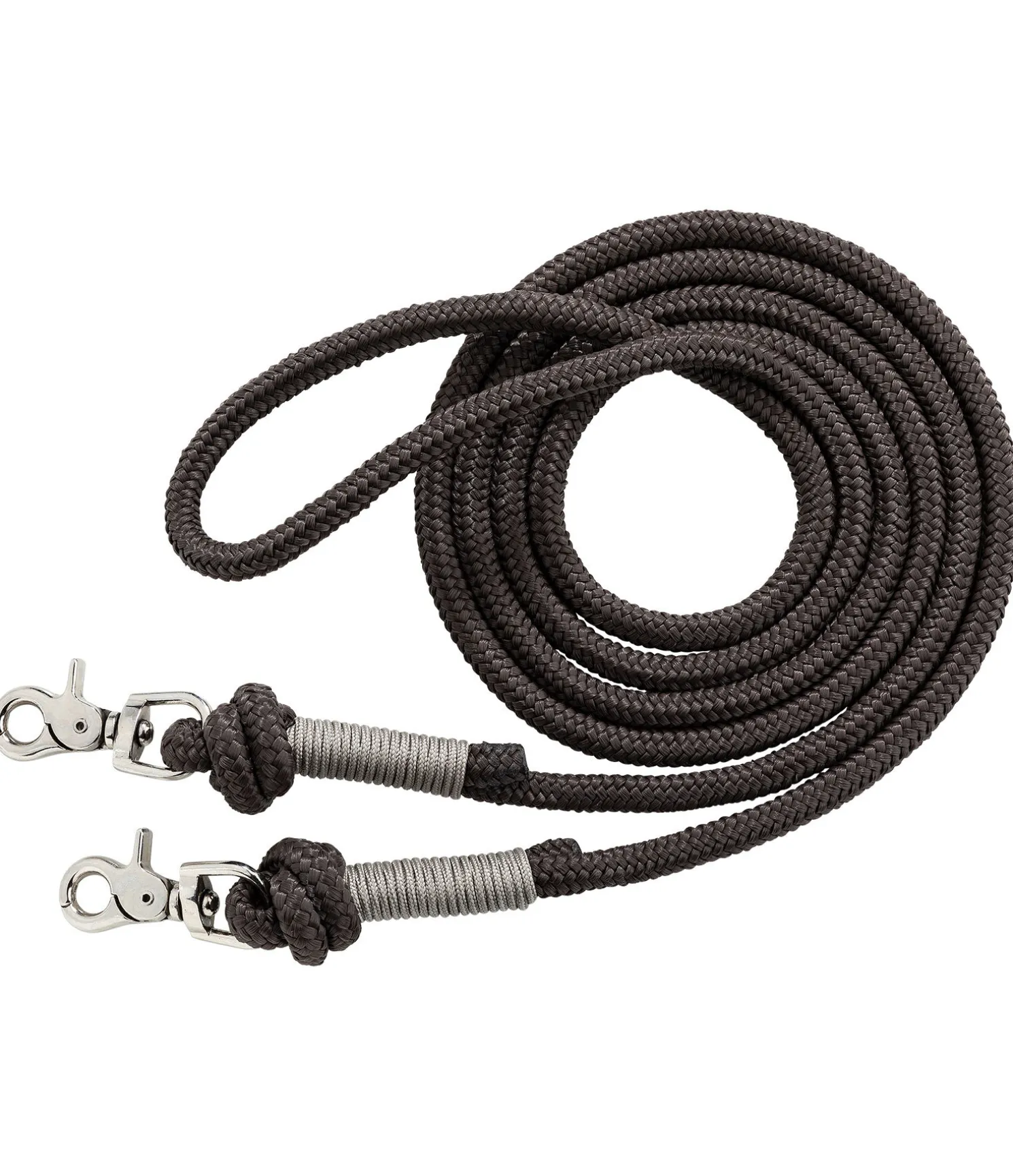 Rênes fermées particulièrement légères pour une connexion précise avec la bouche du cheval. Épaisseur 1,2 cm. Longueur (bout à bout) : 3 m. 100 % polyester.
