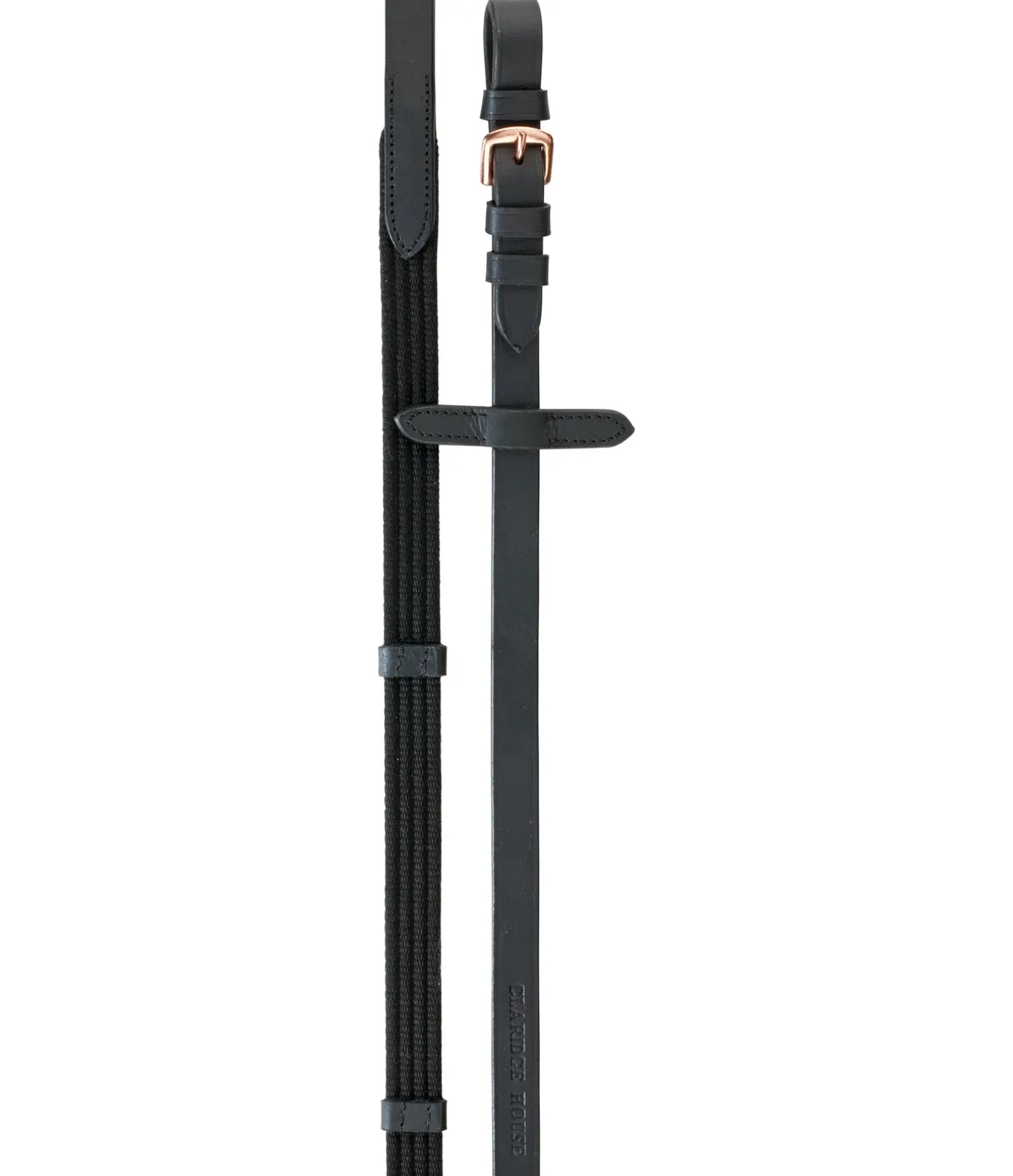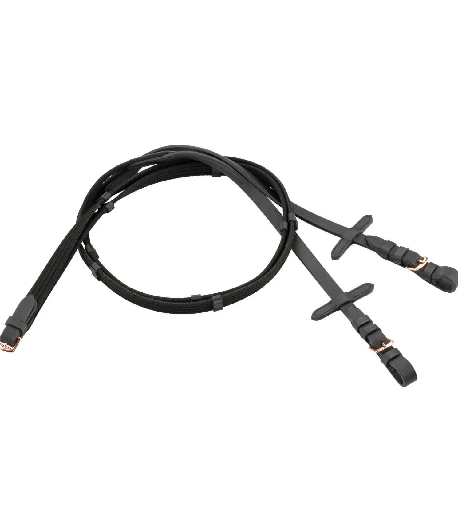 Rênes en cuir gras véritable souple de grande qualité, permettant une bonne prise en main. Arrêtoirs de martingale. Bouclerie argentée en S et DB, et rose doré en SR. Largeur 2 cm.