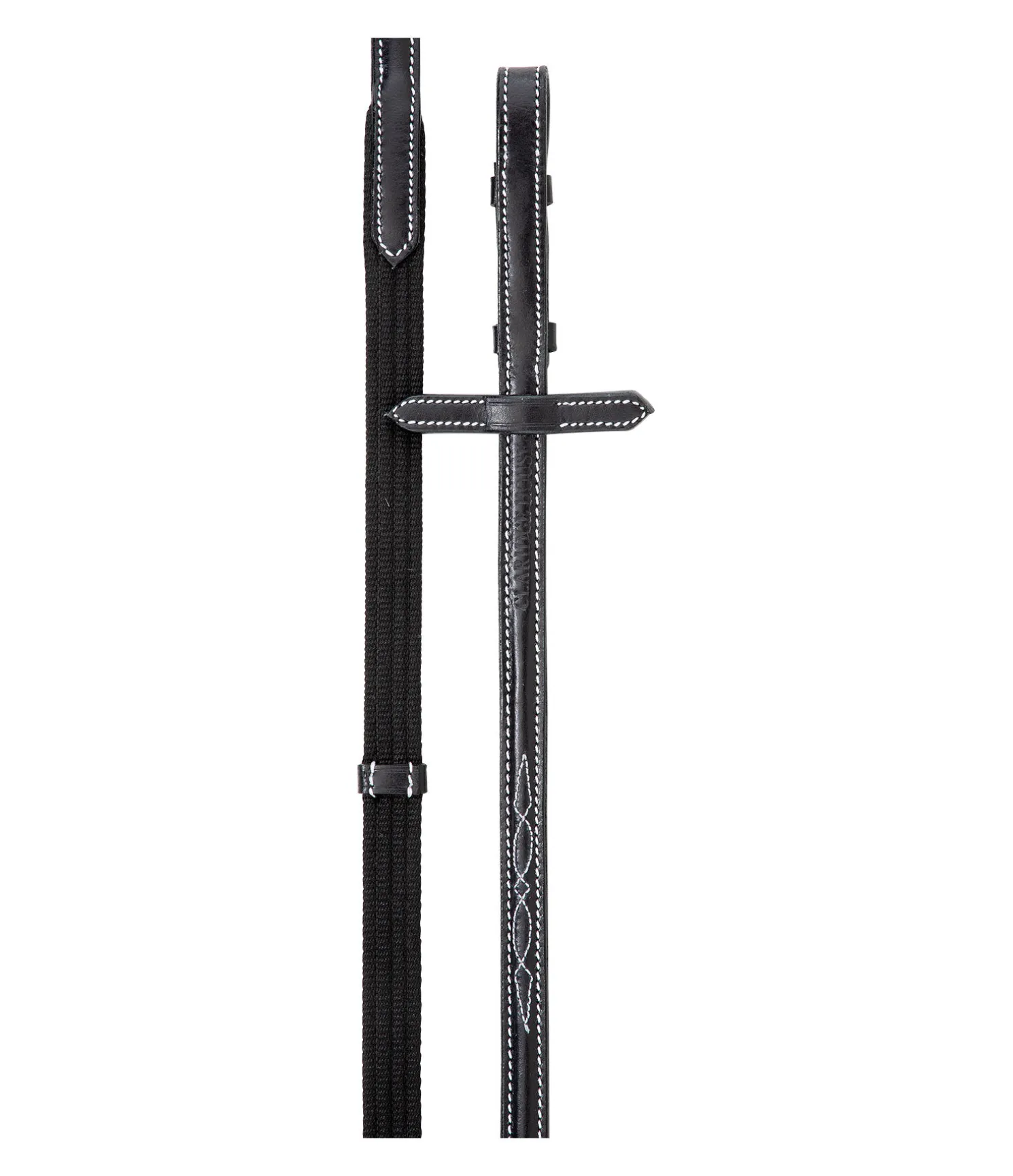 Rênes en cuir gras véritable de grande qualité, souples et antidérapantes. Surpiqûres élégantes de couleur contrastante pour un aspect unique. Avec arrêtoirs de martingale. Compatibles avec les bridons 320830 et 320831