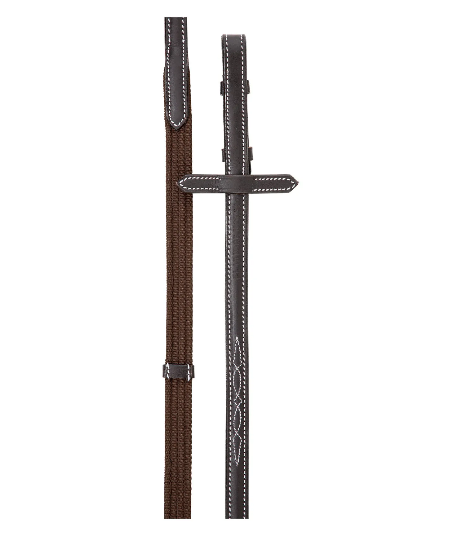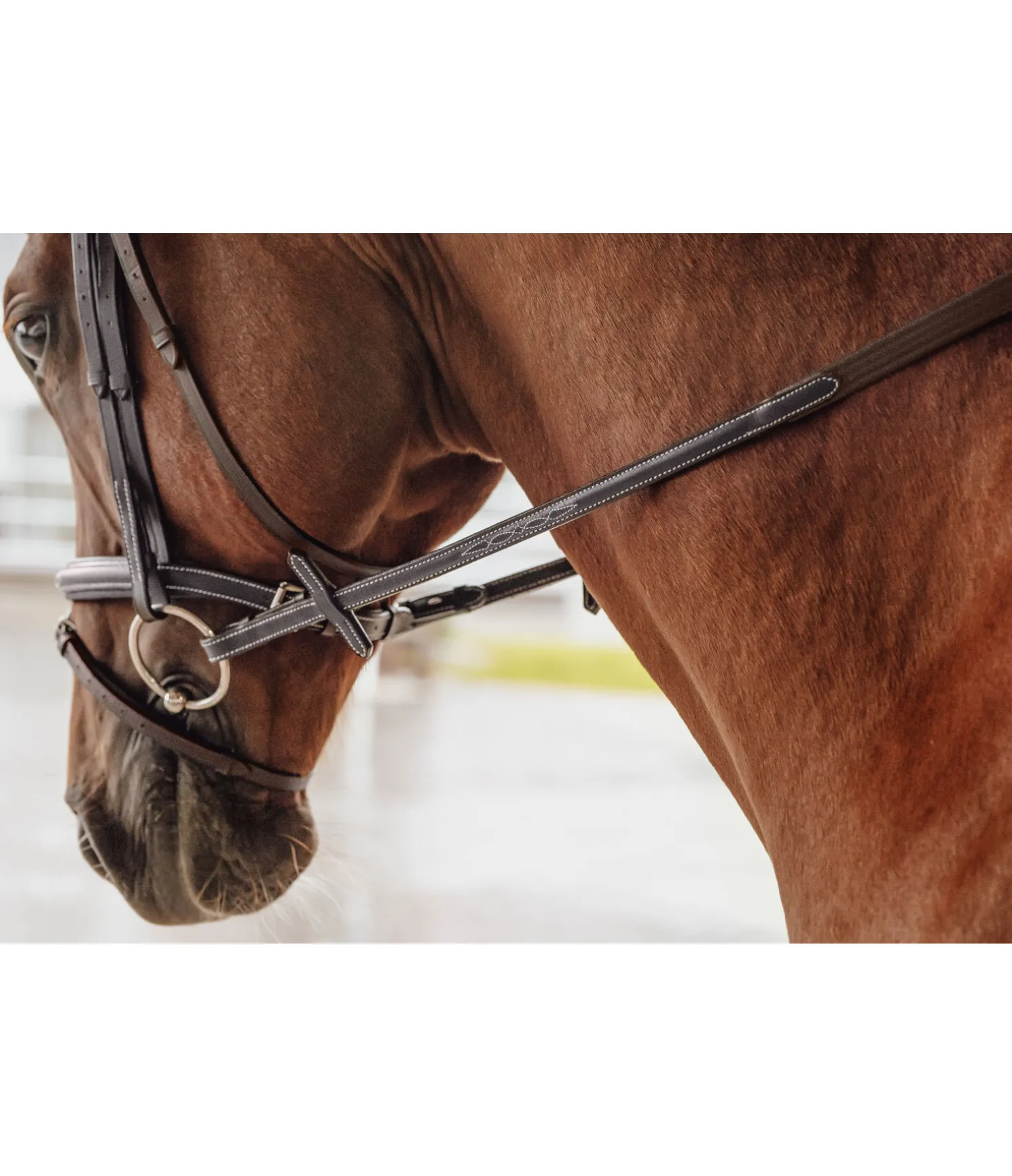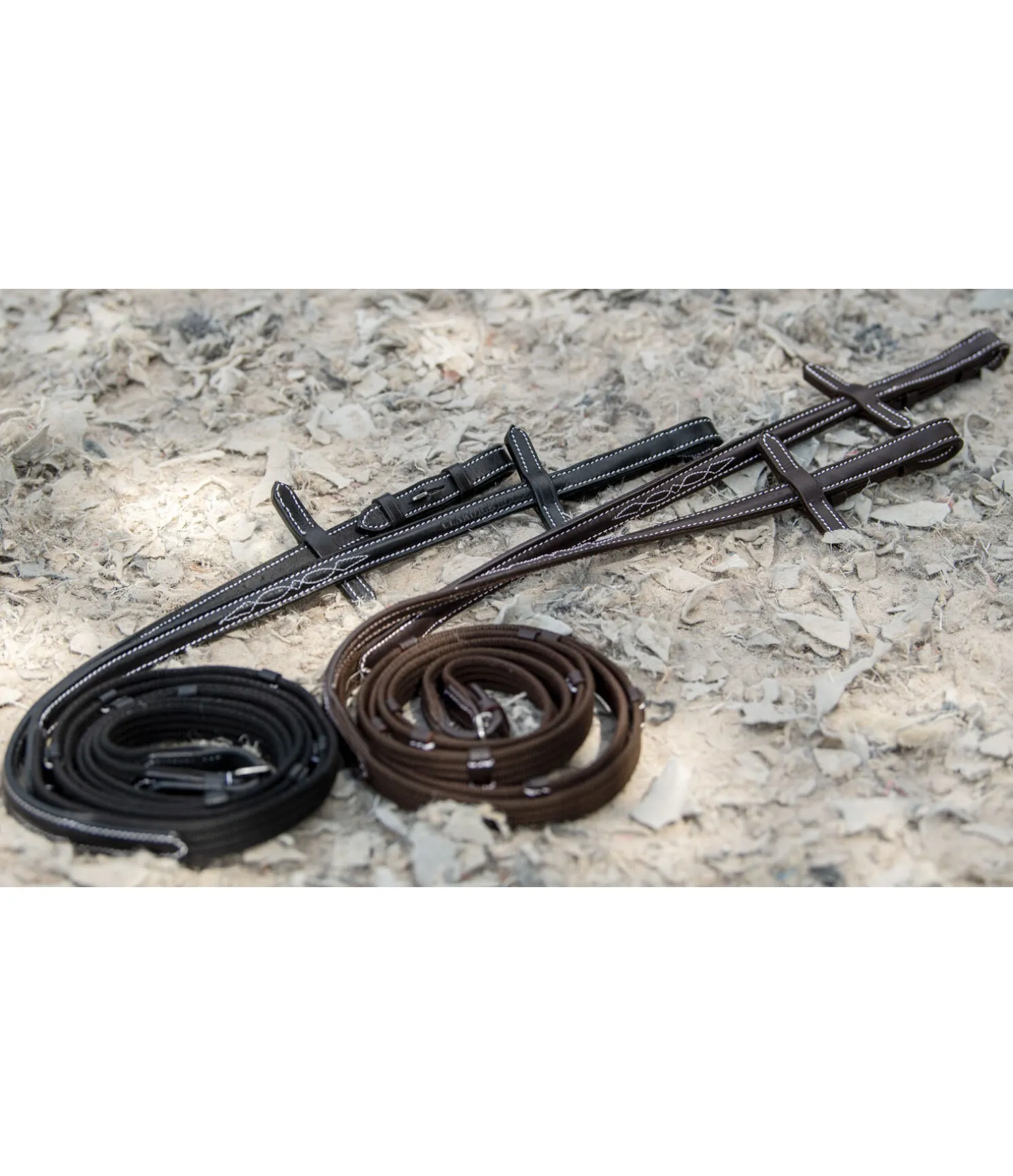Rênes en cuir gras véritable de grande qualité, souples et antidérapantes. Surpiqûres élégantes de couleur contrastante pour un aspect unique. Avec arrêtoirs de martingale. Compatibles avec les bridons 320830 et 320831
