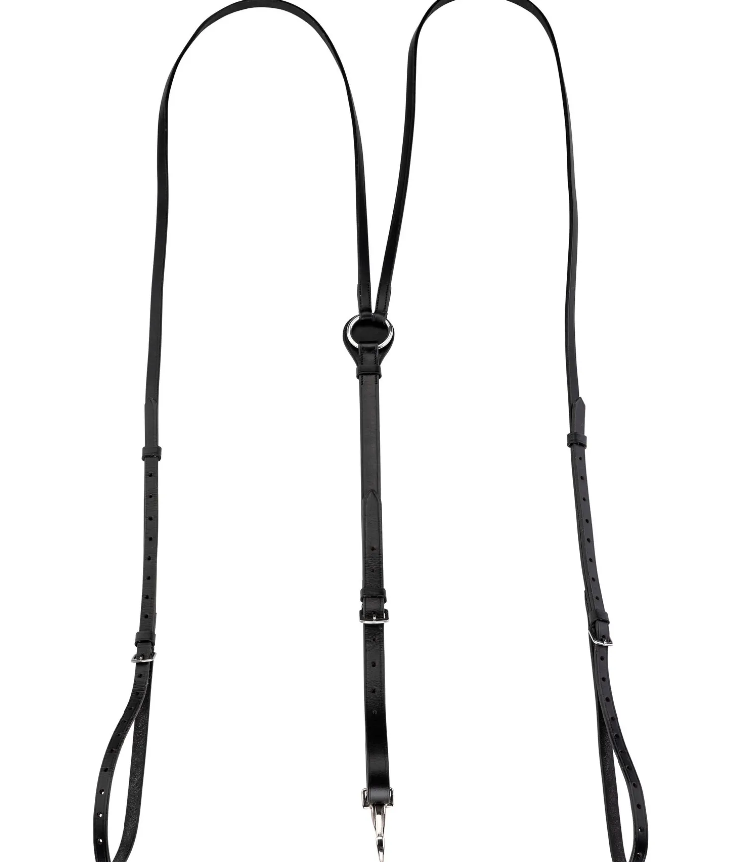 Rênes viennoises réglables en cuir pour le travail en longe et monté. Faciles et rapides à fixer à la sangle grâce aux mousquetons, réglables en longueur. Les extrêmités passent dans les anneaux du mors (de l’intérieur vers l’extérieur) et sont fixées à la selle au niveau des contre-sanglons ou aux anneaux du surfaix. Elles aident le cheval à trouver son équilibre, sans qu’il ne s’appuie sur le mors. Cuir véritable.