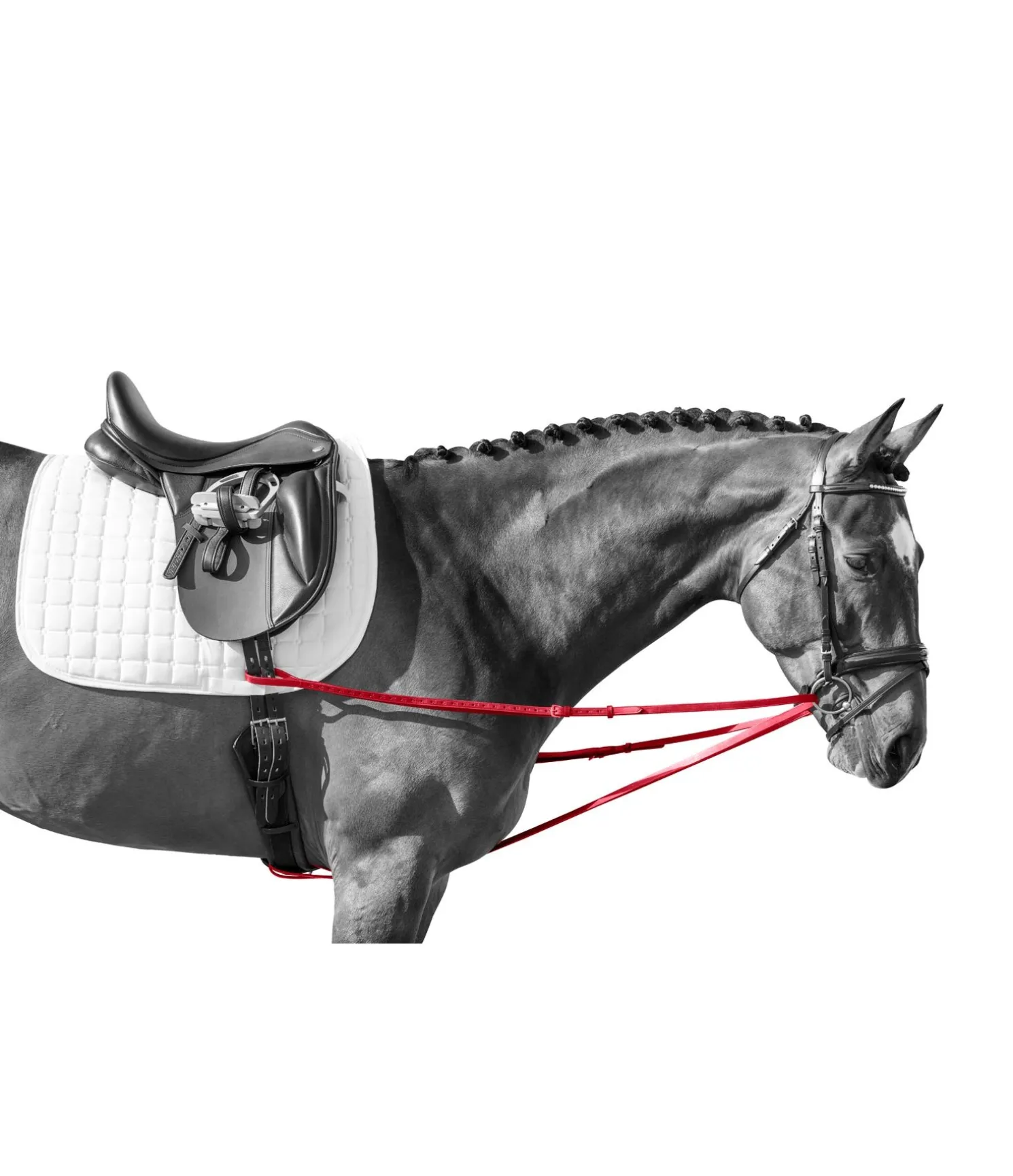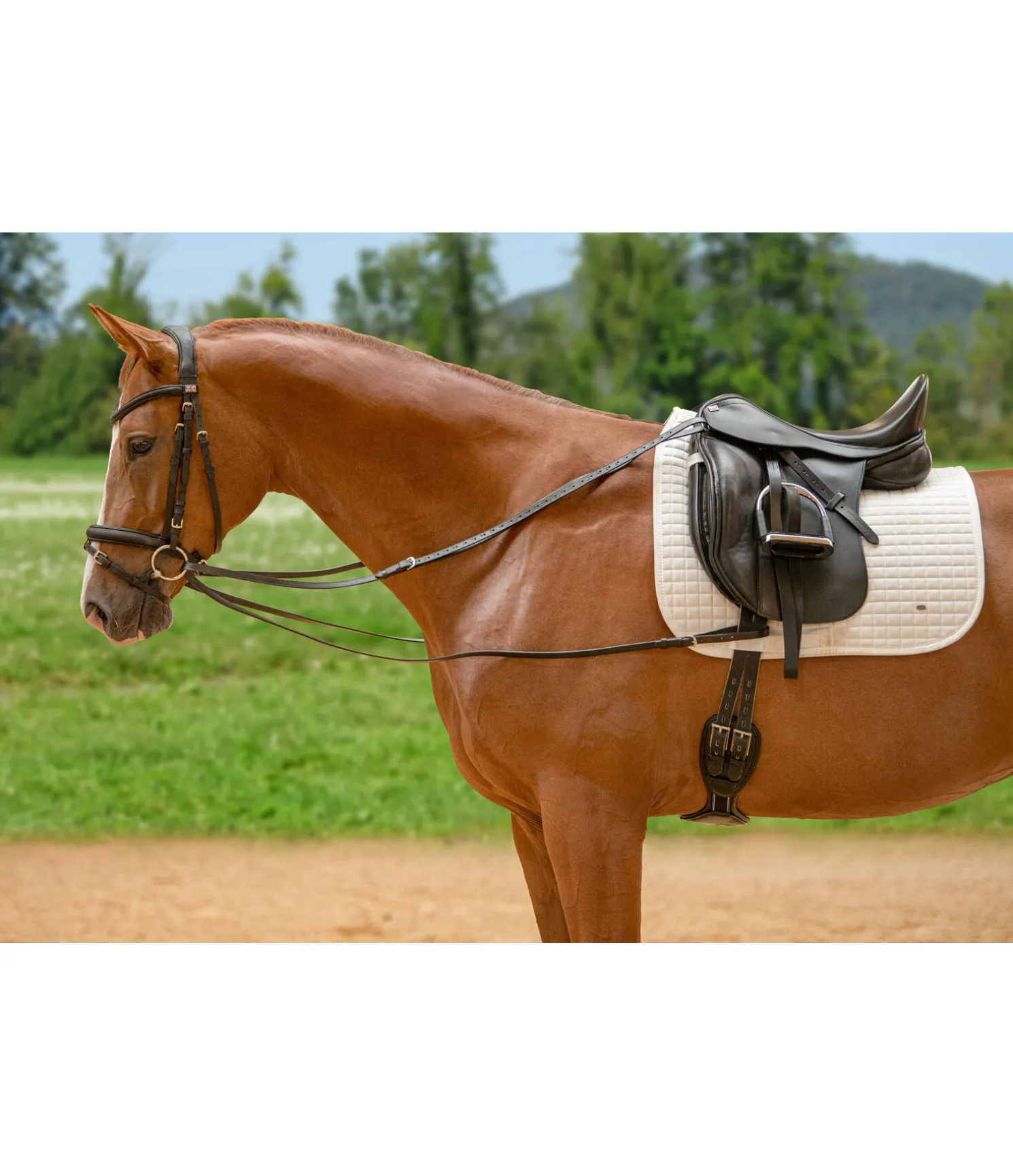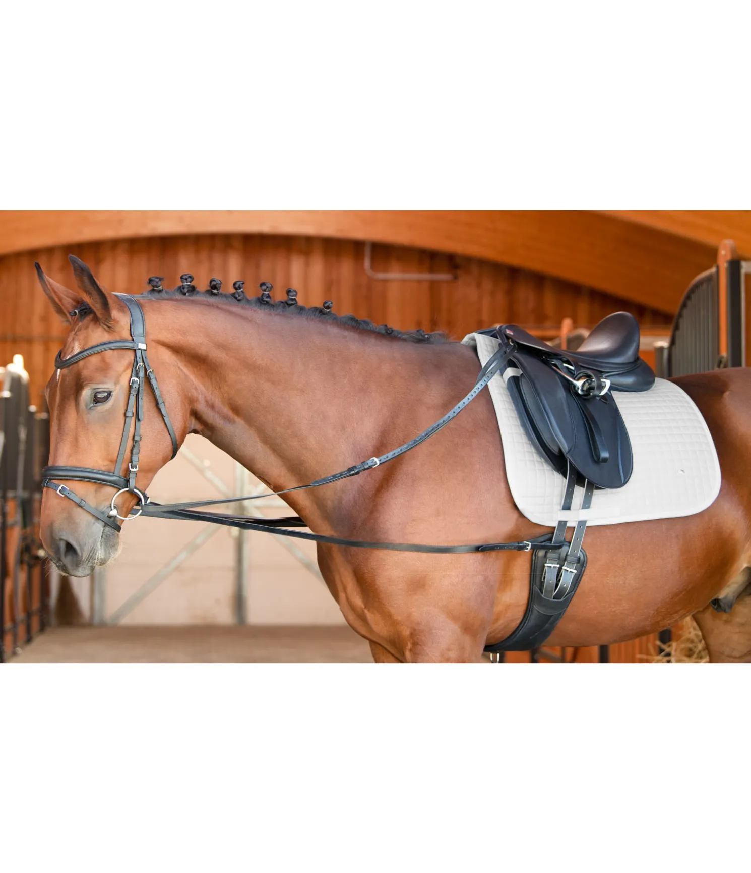 Les rênes viennoises sont principalement appropriées pour le travail à la longe et peuvent facilement se fixer aux anneaux du surfaix. Pour le travail monté, la longue rêne d’env. 2,25 m doit être fixée de chaque côté des quartiers grâce aux boucles. Elle passe ensuite dans les anneaux du mors, de l’intérieur vers l’extérieur, pour venir se fixer à la sangle grâce aux deux boucles, et ainsi éviter de glisser vers le bas. (doit se placer au dessus du passant de sangle fixé à la chabraque)